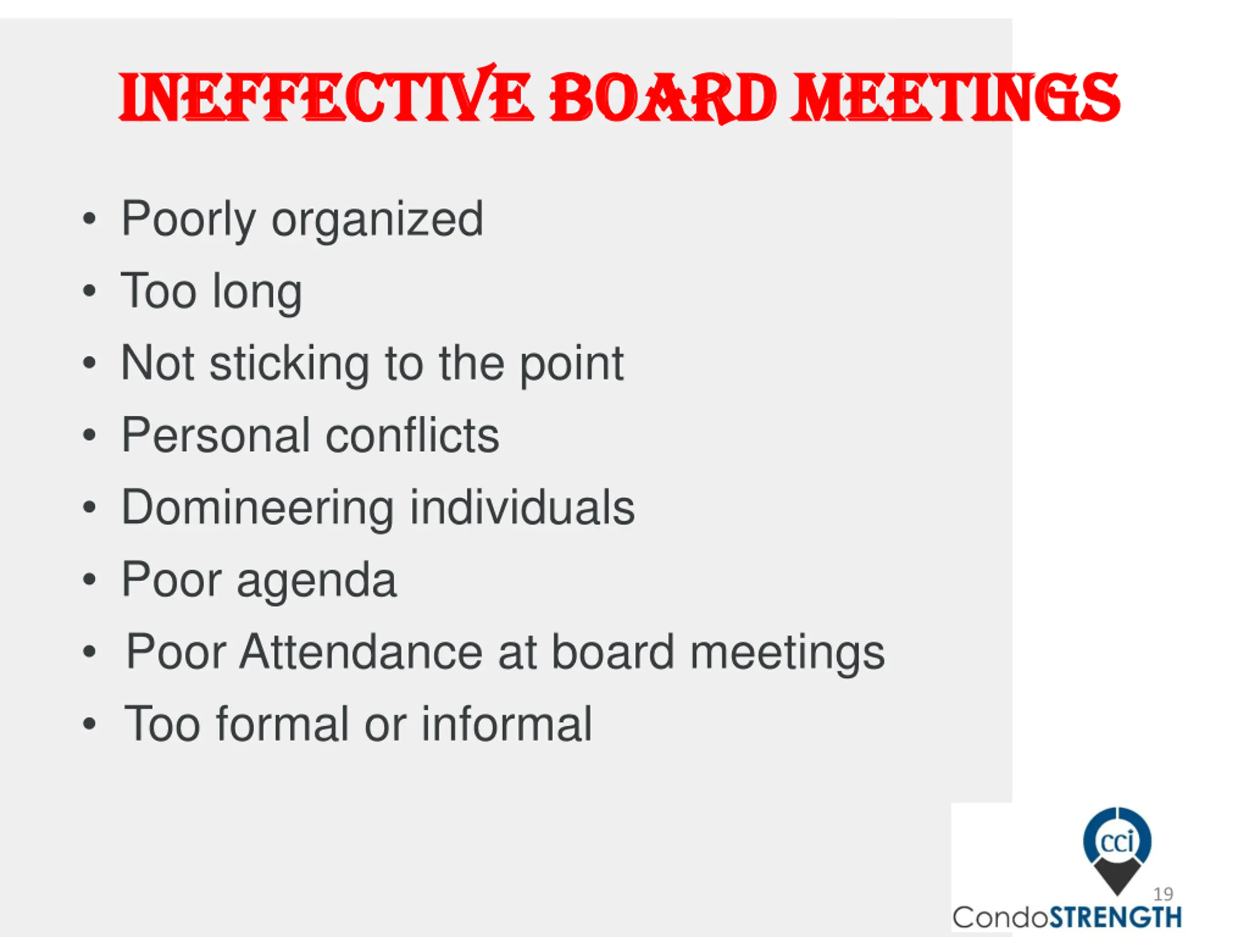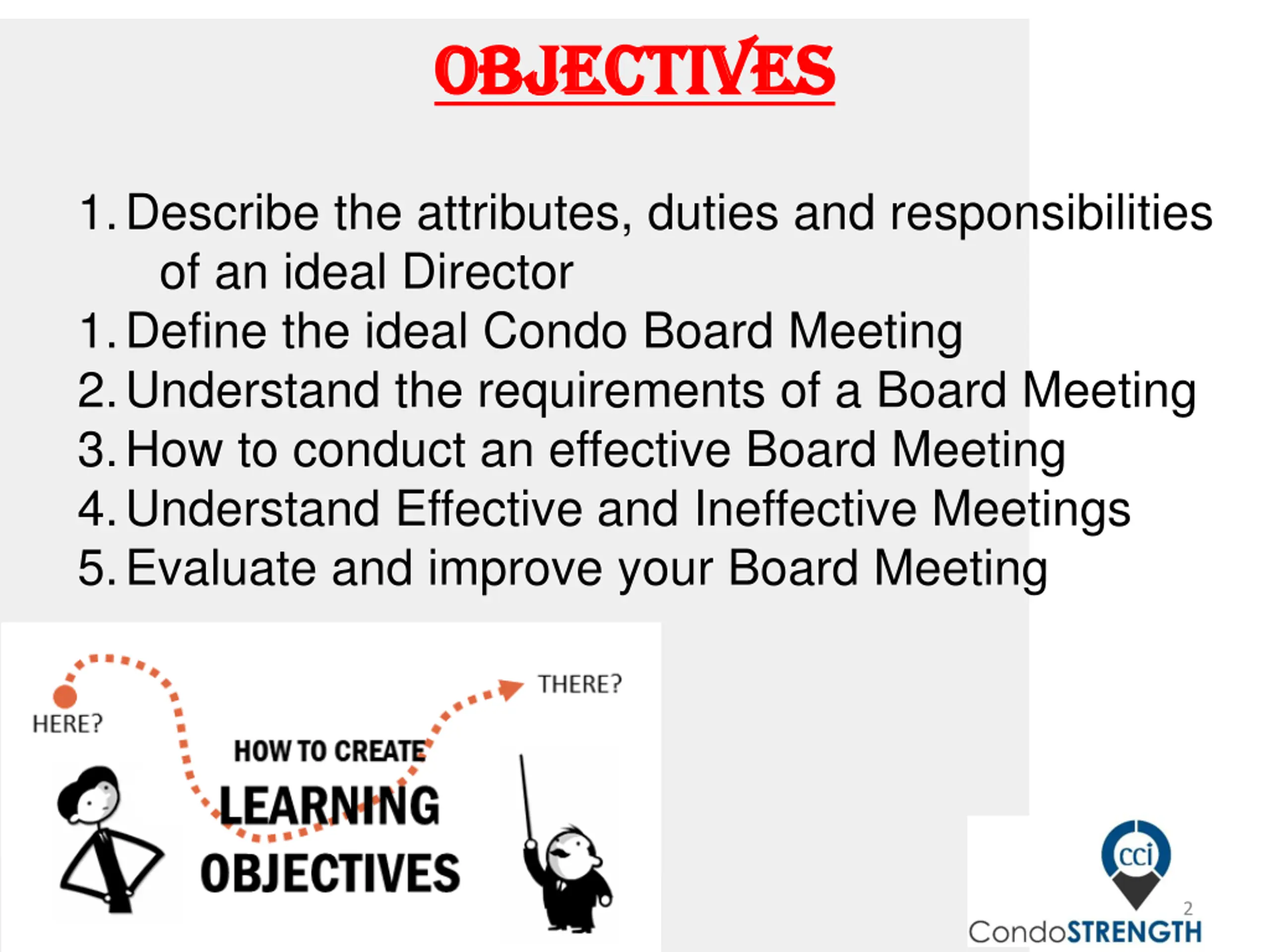 o objectives bjectives 1.Describe the attributes, duties and responsibilities of an ideal Director 1.Define the ideal Condo Board Meeting 2.Understand the requirements of a Board Meeting 3.How to conduct an effective Board Meeting 4.Understand Effective and Ineffective Meetings 5.Evaluate and improve your Board Meeting 2