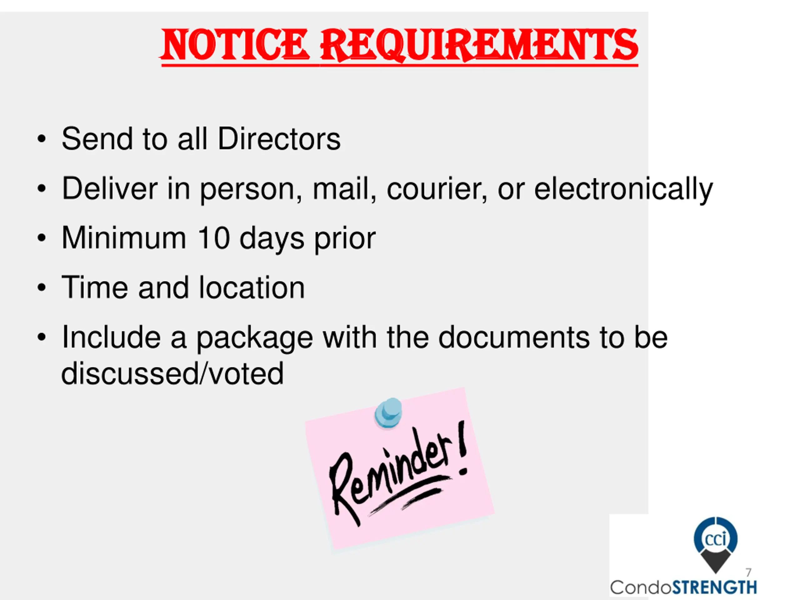 Notice Notice requirements requirements Send to all Directors Deliver in person, mail, courier, or electronically Minimum 10 days prior Time and location Include a package with the documents to be discussed/voted 7