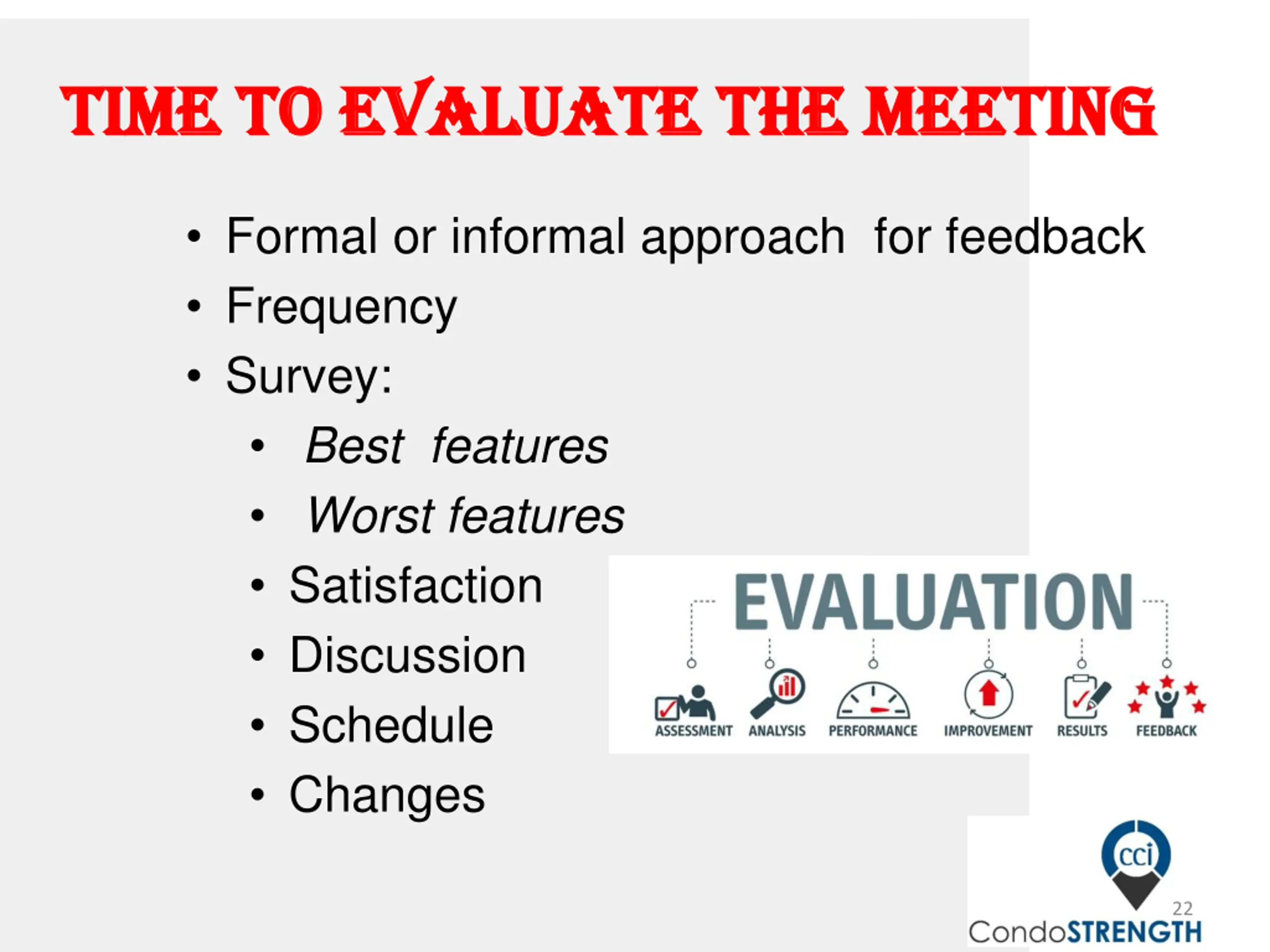 Time to evaluate the Time to evaluate the meeting meeting Formal or informal approach for feedback Frequency Survey: Bestfeatures Worst features Satisfaction Discussion Schedule Changes 22