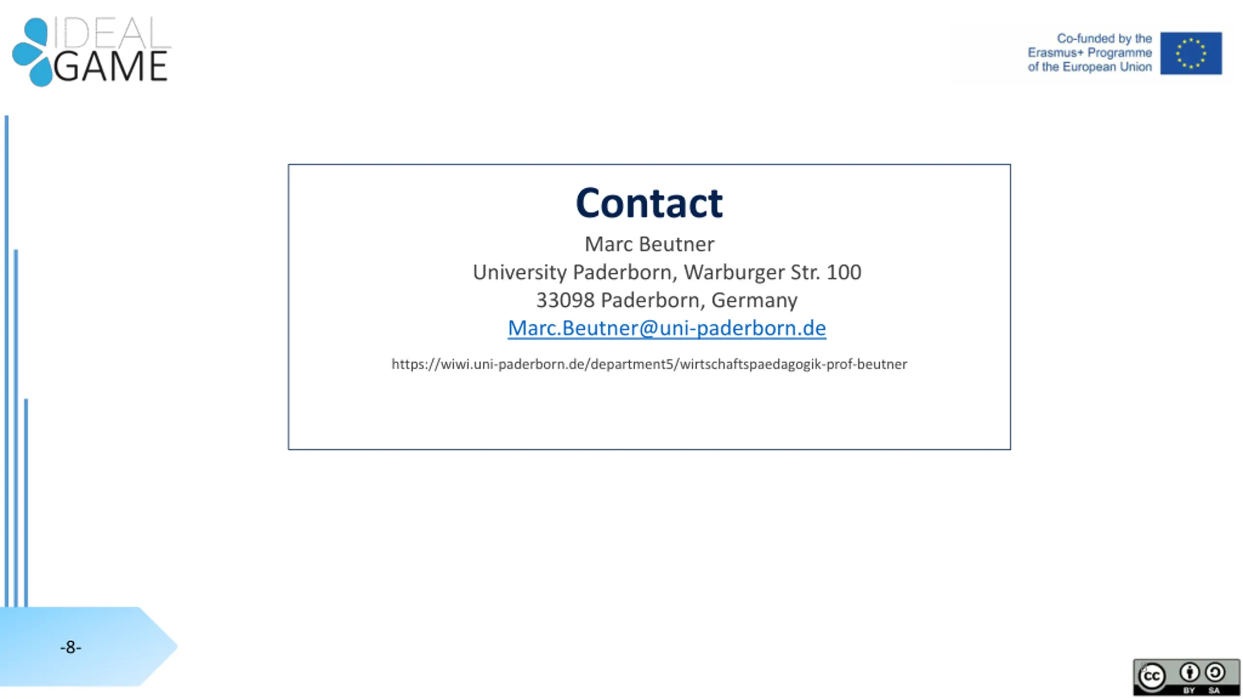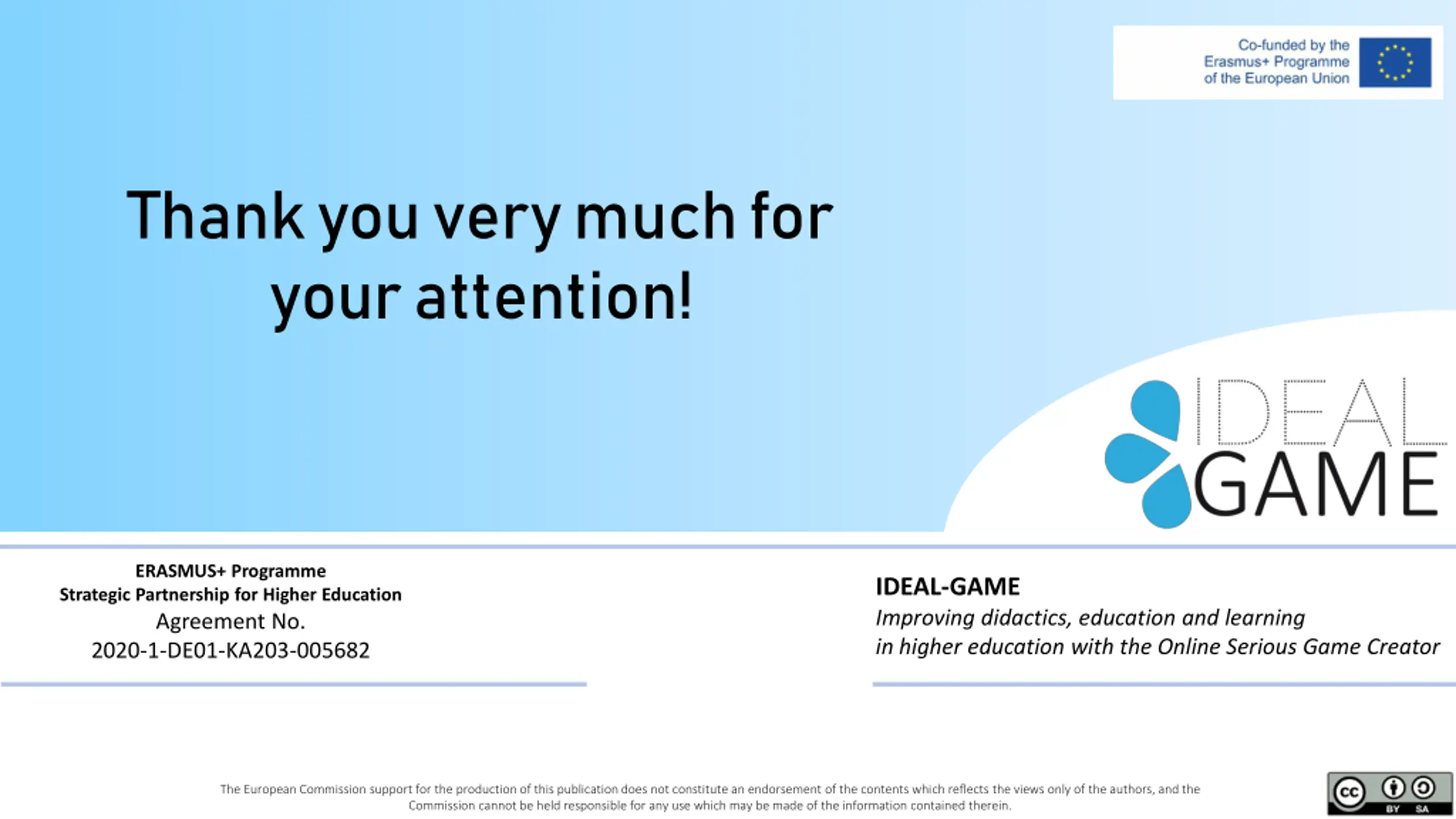 Thank you very much for your attention! ERASMUS+ Programme Strategic Partnership for Higher Education Agreement No. 2020-1-DE01-KA203-005682 IDEAL-GAME Improving didactics, education and learning in higher education with the Online Serious Game Creator The European Commission support for the production of this publication does not constitute an endorsement of the contents which reflects the views only of the authors, and the Commission cannot be held responsible for any use which may be made of the information contained therein.