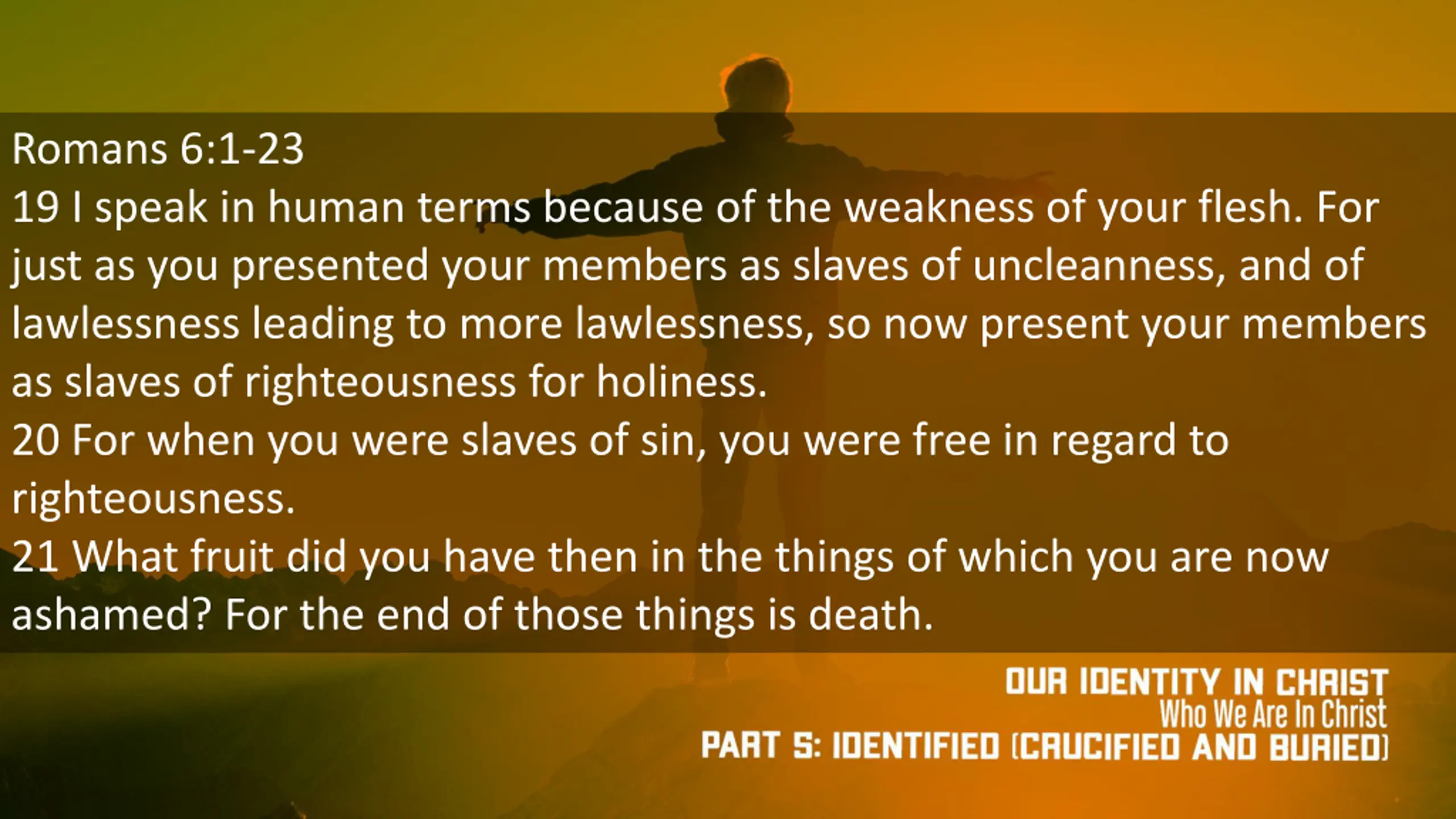 Romans 6:1-23 19 I speak in human terms because of the weakness of your flesh. For just as you presented your members as slaves of uncleanness, and of lawlessness leading to more lawlessness, so now present your members as slaves of righteousness for holiness. 20 For when you were slaves of sin, you were free in regard to righteousness. 21 What fruit did you have then in the things of which you are now ashamed? For the end of those things is death.