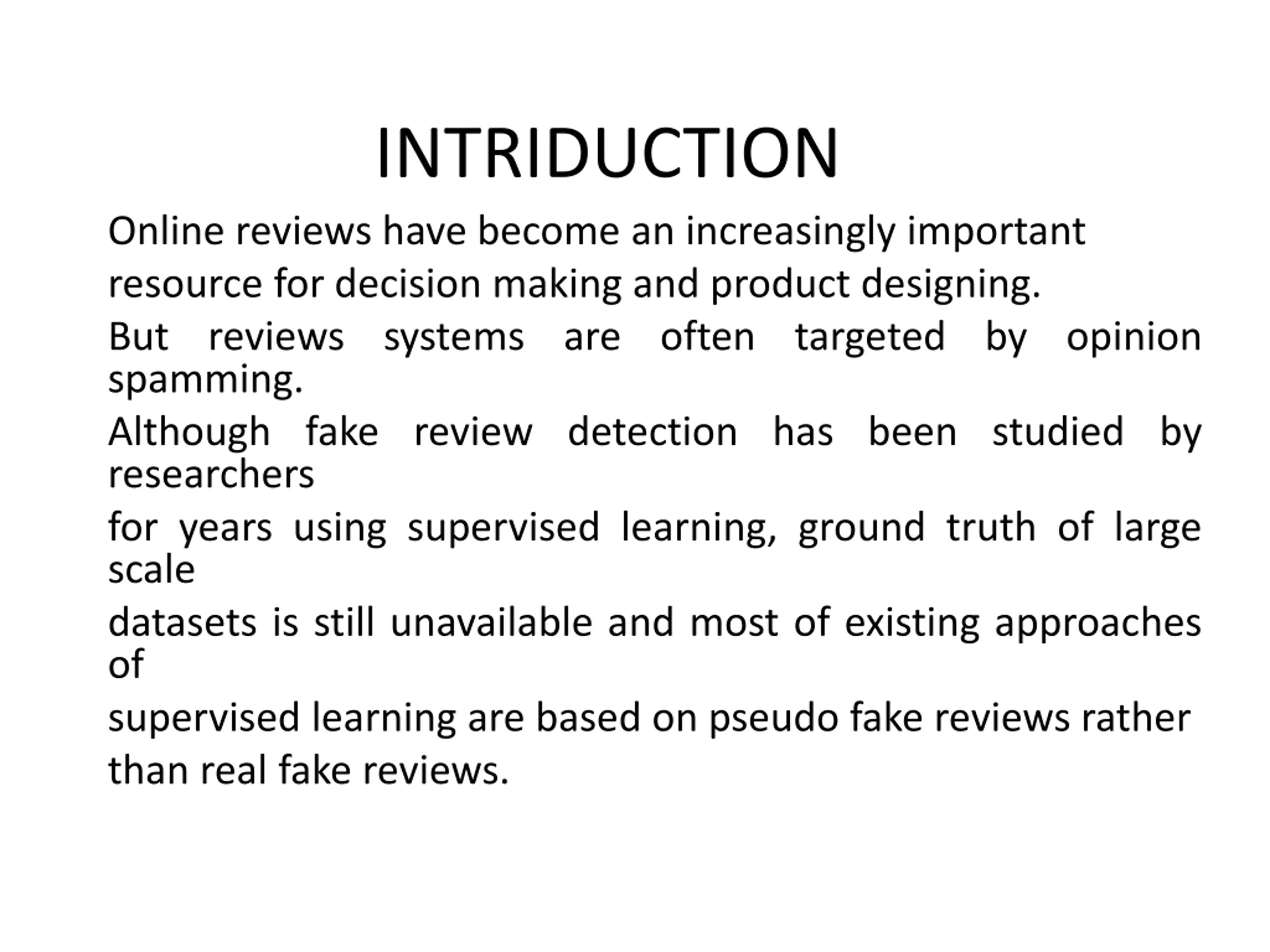 INTRIDUCTION Online reviews have become an increasingly important resource for decision making and product designing. But reviews systems are often targeted by opinion spamming. Although fake review detection has been studied by researchers for years using supervised learning, ground truth of large scale datasets is still unavailable and most of existing approaches of supervised learning are based on pseudo fake reviews rather than real fake reviews.
