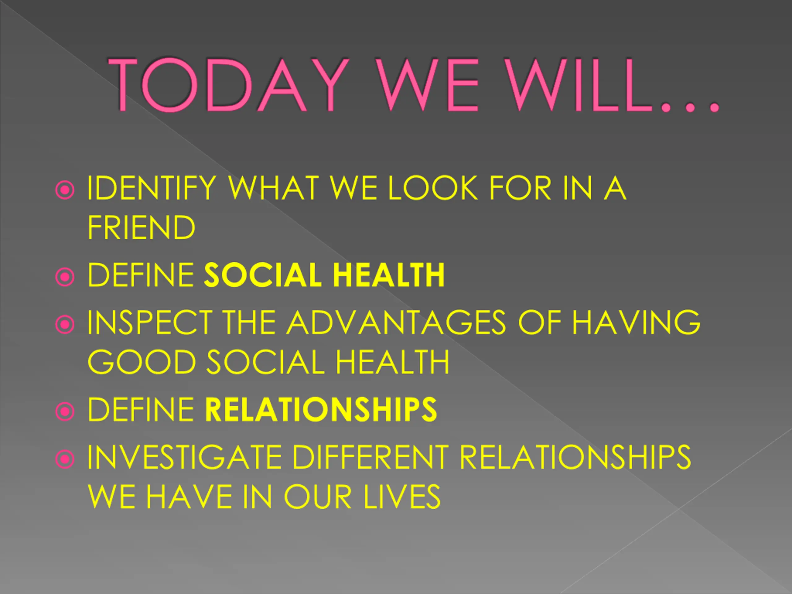 TODAY WE WILL IDENTIFY WHAT WE LOOK FOR IN A FRIEND DEFINE SOCIAL HEALTH INSPECT THE ADVANTAGES OF HAVING GOOD SOCIAL HEALTH DEFINE RELATIONSHIPS INVESTIGATE DIFFERENT RELATIONSHIPS WE HAVE IN OUR LIVES