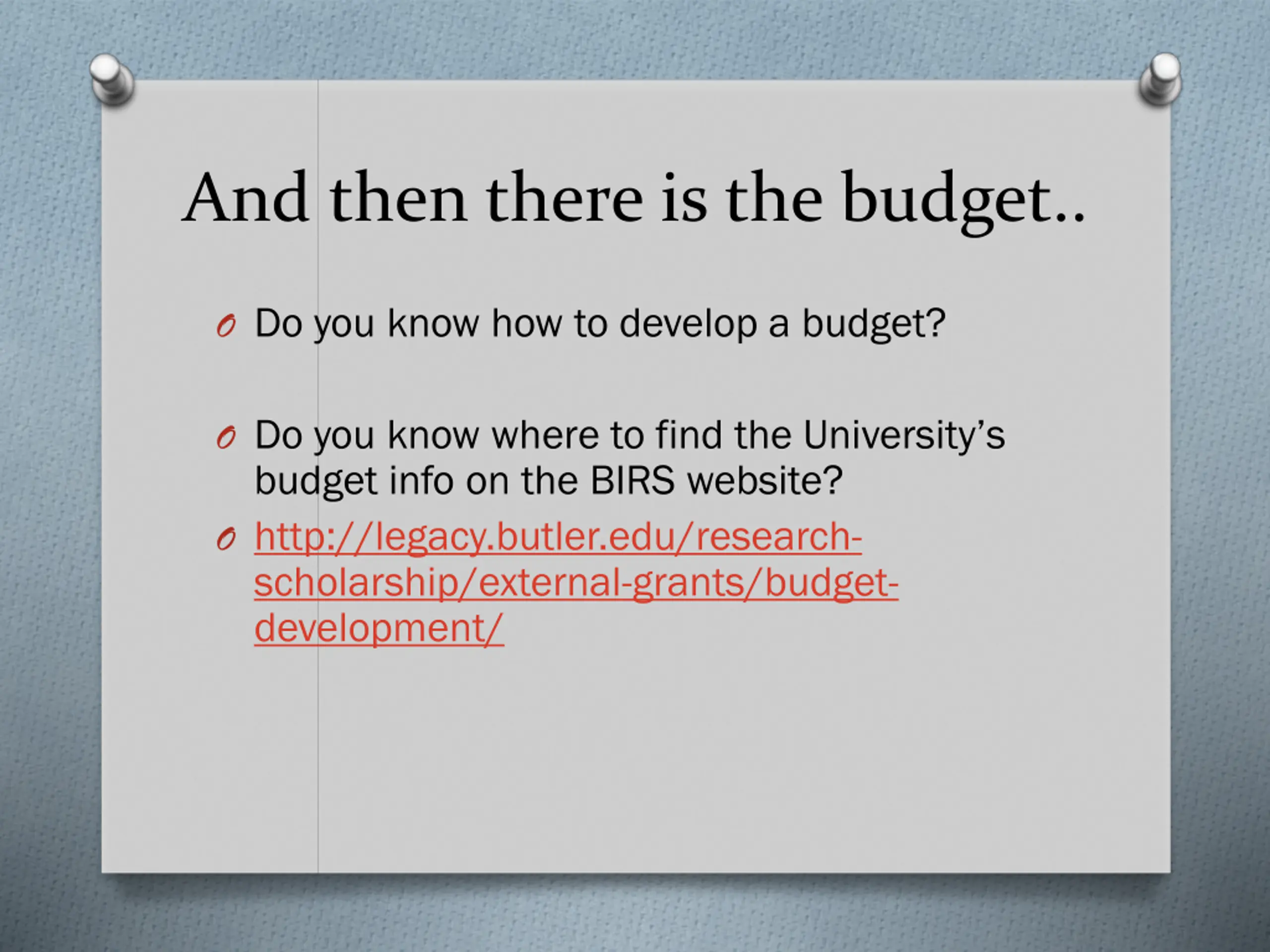 And then there is the budget.. O Do you know how to develop a budget? O Do you know where to find the University s budget info on the BIRS website? O http://legacy.butler.edu/research- scholarship/external-grants/budget- development/