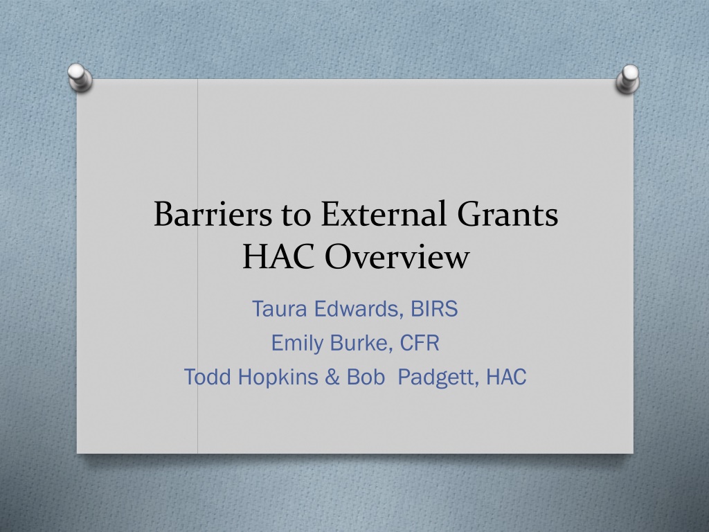 Barriers to External Grants HAC Overview Taura Edwards, BIRS Emily Burke, CFR Todd Hopkins & Bob Padgett, HAC