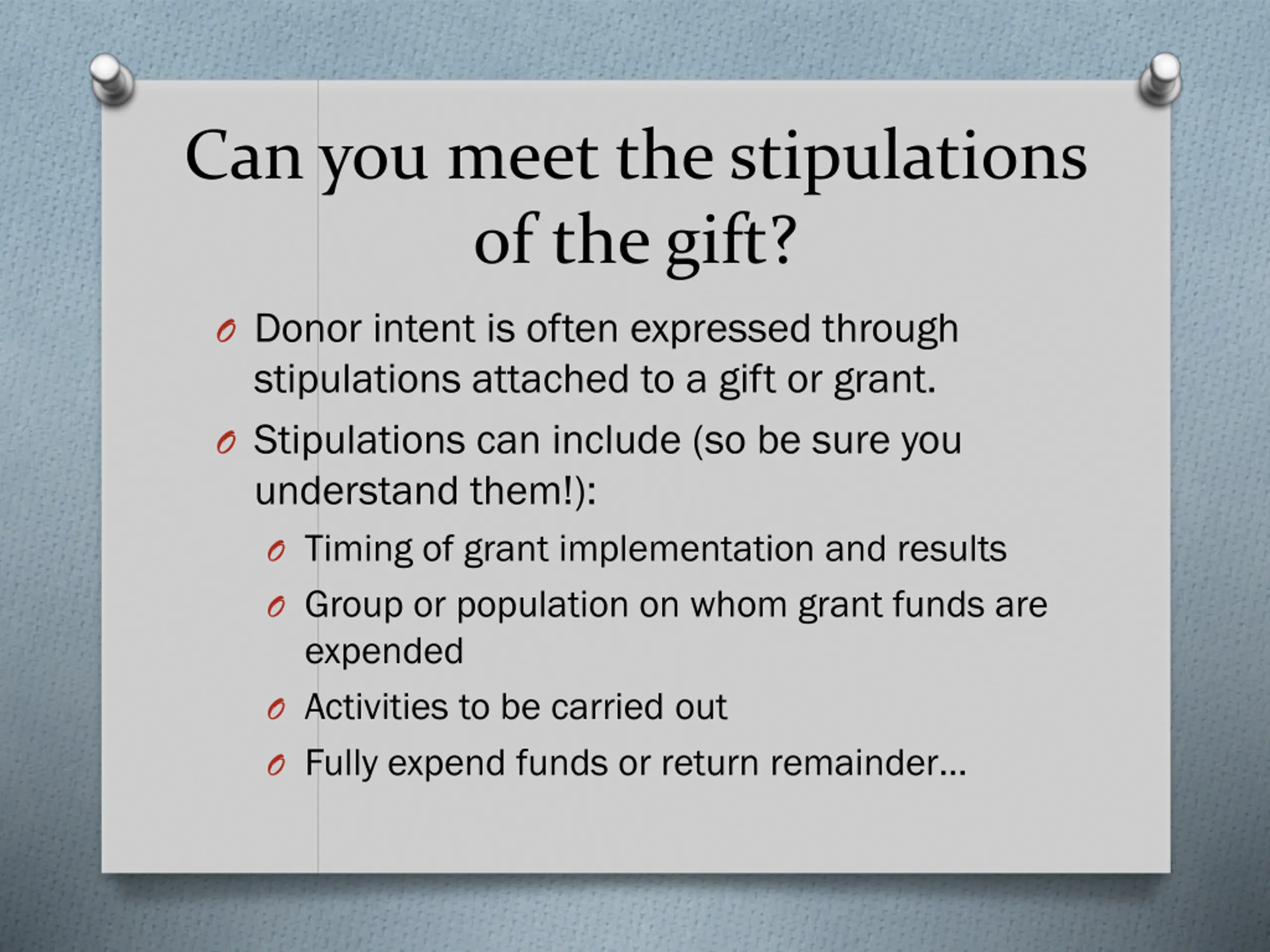 Can you meet the stipulations of the gift? O Donor intent is often expressed through stipulations attached to a gift or grant. O Stipulations can include (so be sure you understand them!): O Timing of grant implementation and results O Group or population on whom grant funds are expended O Activities to be carried out O Fully expend funds or return remainder
