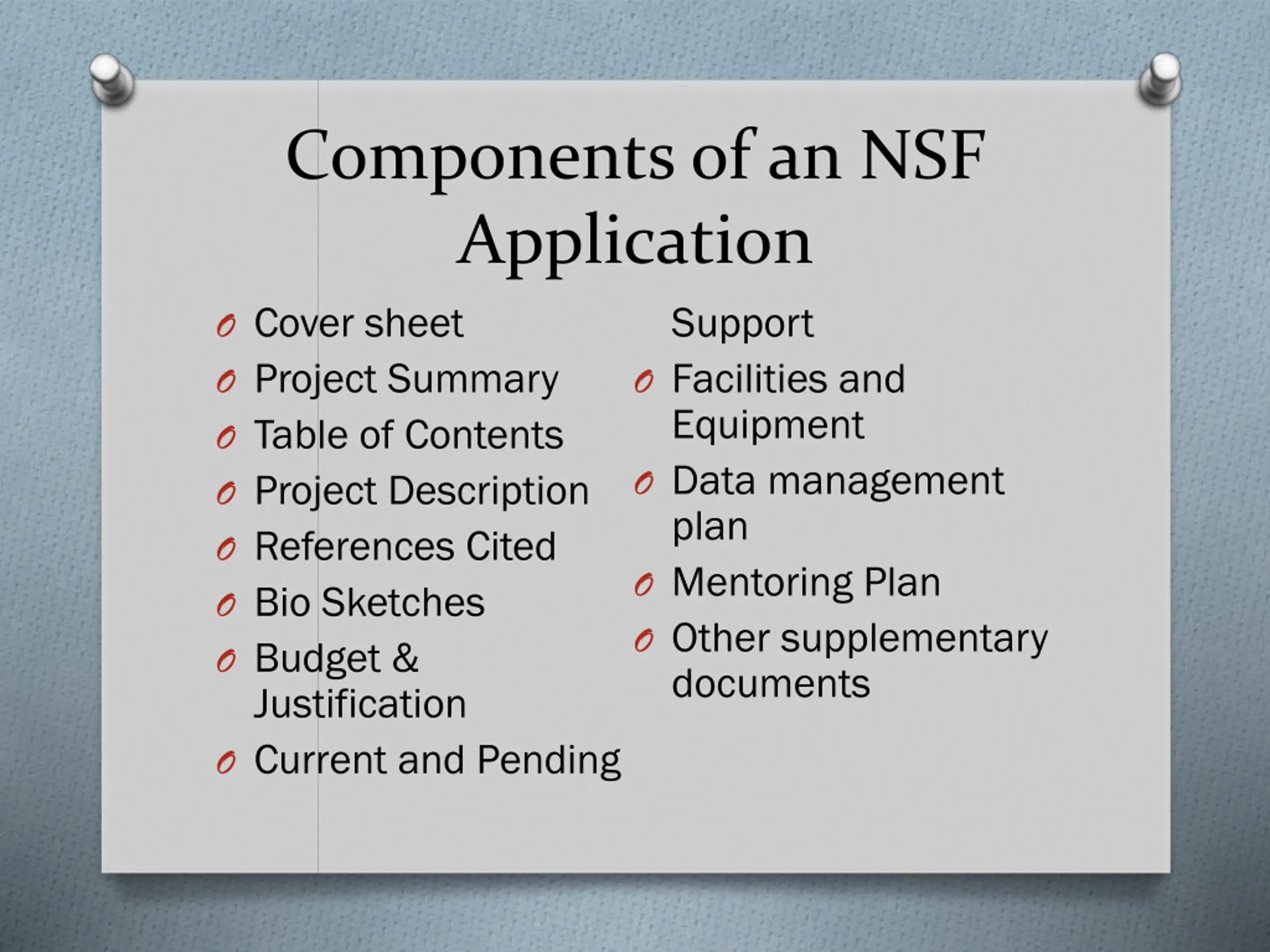 Components of an NSF Application O Cover sheet O Project Summary O Table of Contents O Project Description O References Cited O Bio Sketches O Budget & Justification O Current and Pending Support O Facilities and Equipment O Data management plan O Mentoring Plan O Other supplementary documents