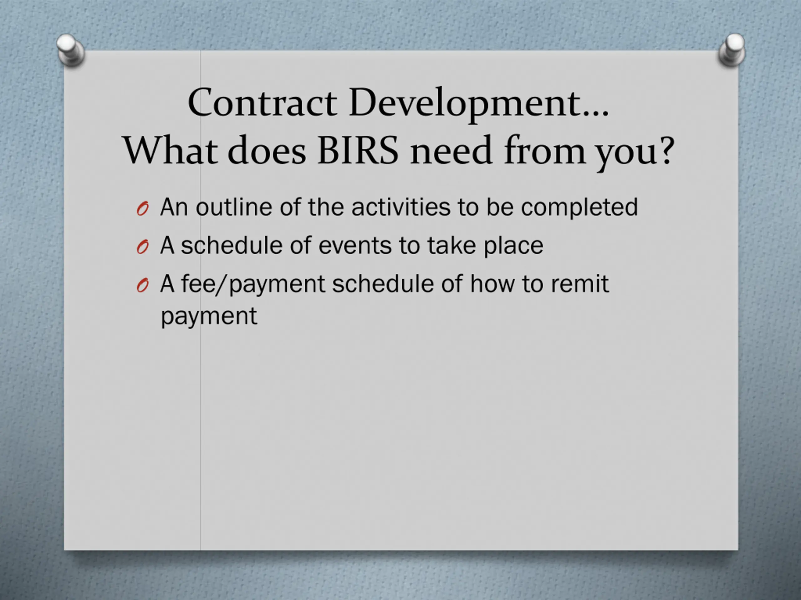Contract Development What does BIRS need from you? O An outline of the activities to be completed O A schedule of events to take place O A fee/payment schedule of how to remit payment