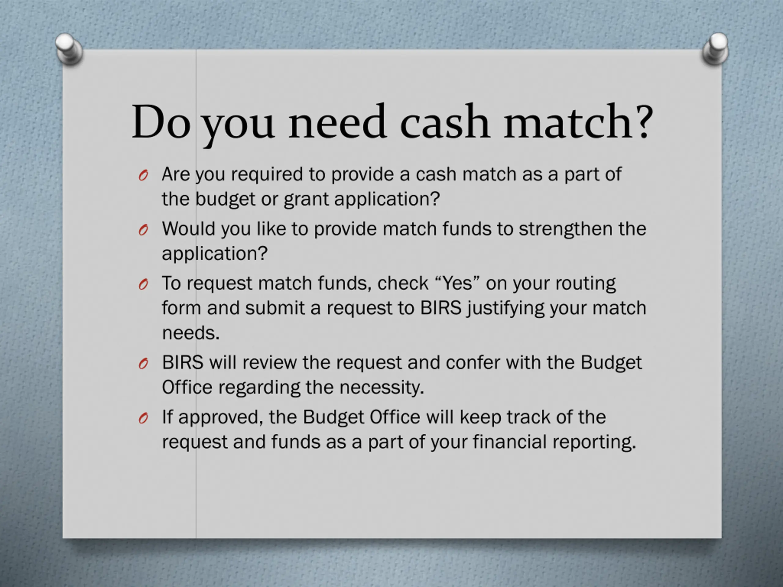 Do you need cash match? O Are you required to provide a cash match as a part of the budget or grant application? O Would you like to provide match funds to strengthen the application? O To request match funds, check Yes on your routing form and submit a request to BIRS justifying your match needs. O BIRS will review the request and confer with the Budget Office regarding the necessity. O If approved, the Budget Office will keep track of the request and funds as a part of your financial reporting.
