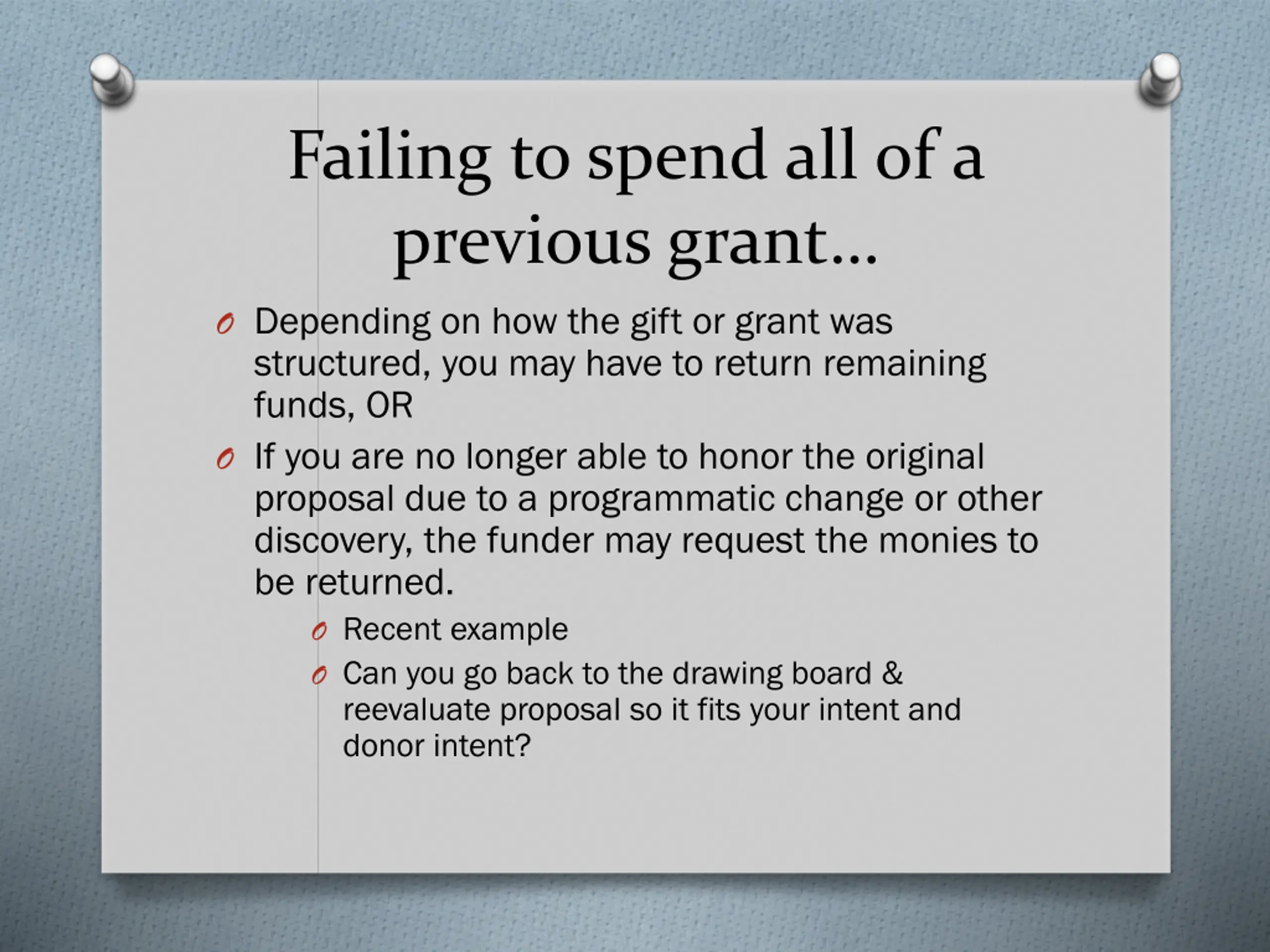Failing to spend all of a previous grant O Depending on how the gift or grant was structured, you may have to return remaining funds, OR O If you are no longer able to honor the original proposal due to a programmatic change or other discovery, the funder may request the monies to be returned. O Recent example O Can you go back to the drawing board & reevaluate proposal so it fits your intent and donor intent?