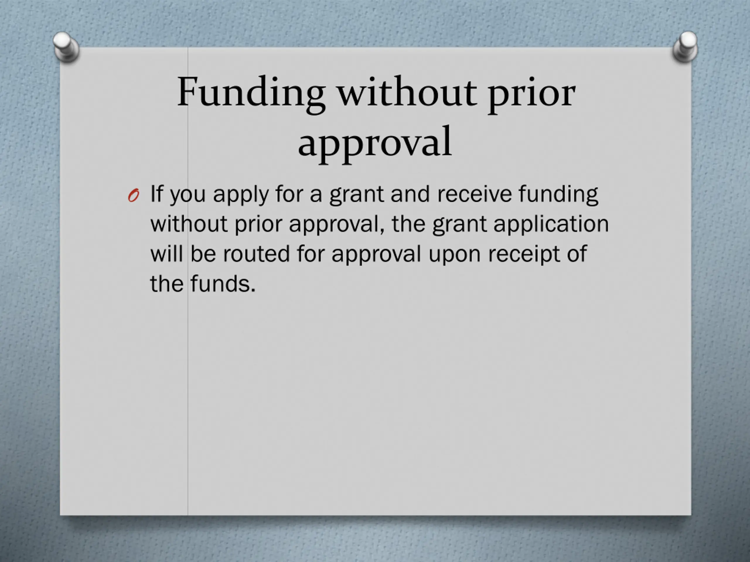 Funding without prior approval O If you apply for a grant and receive funding without prior approval, the grant application will be routed for approval upon receipt of the funds.