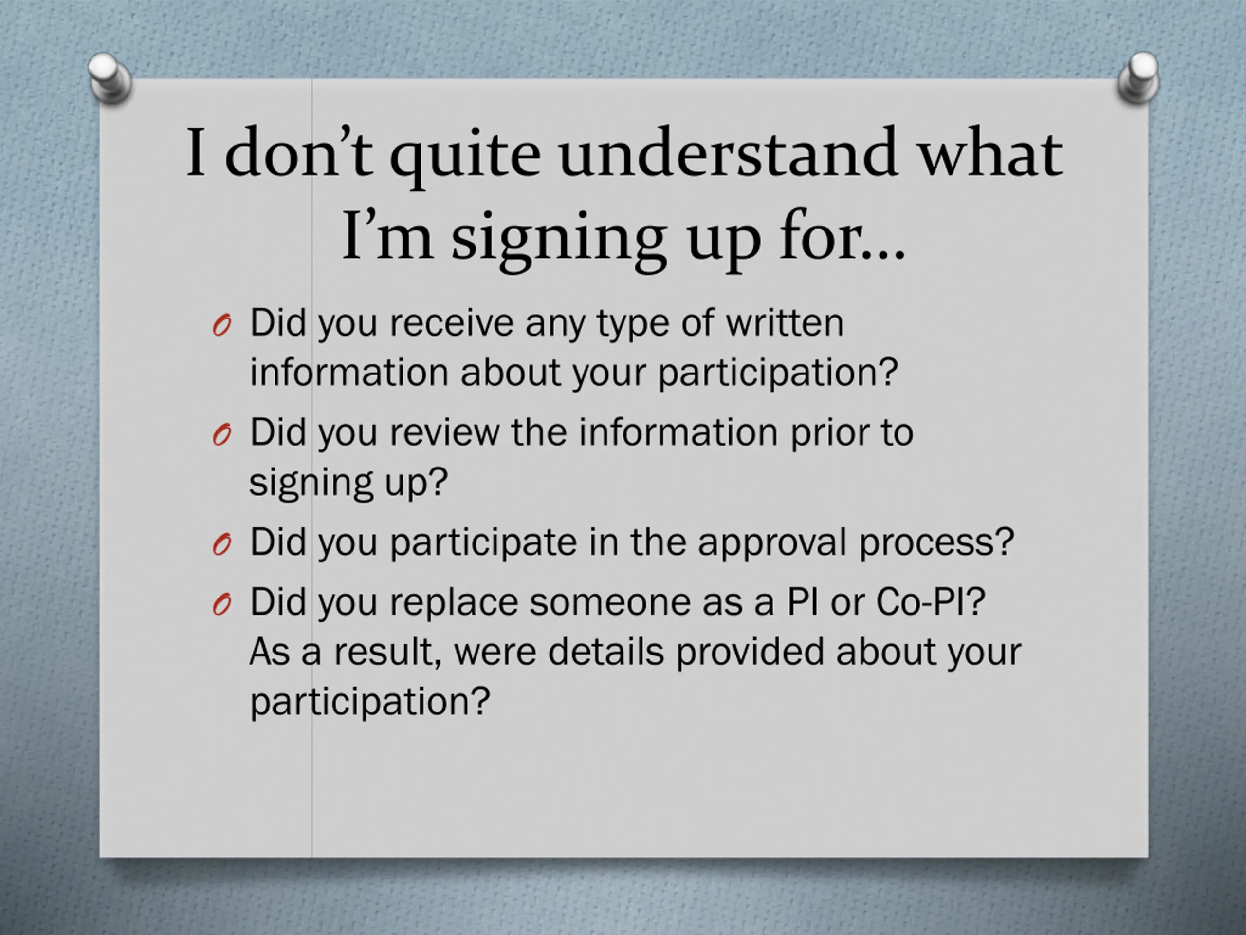 I dont quite understand what I m signing up for O Did you receive any type of written information about your participation? O Did you review the information prior to signing up? O Did you participate in the approval process? O Did you replace someone as a PI or Co-PI? As a result, were details provided about your participation?