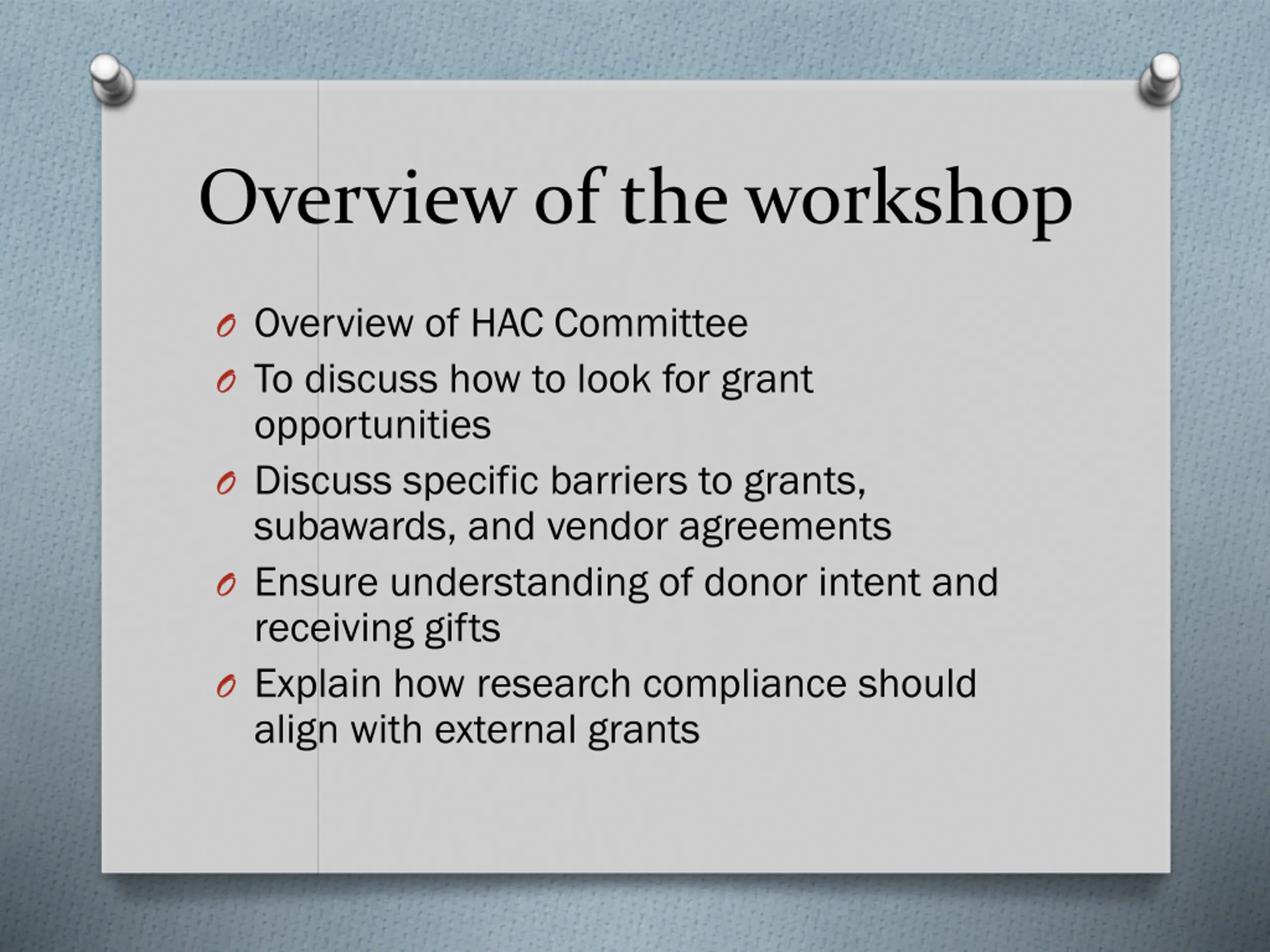 Overview of the workshop O Overview of HAC Committee O To discuss how to look for grant opportunities O Discuss specific barriers to grants, subawards, and vendor agreements O Ensure understanding of donor intent and receiving gifts O Explain how research compliance should align with external grants