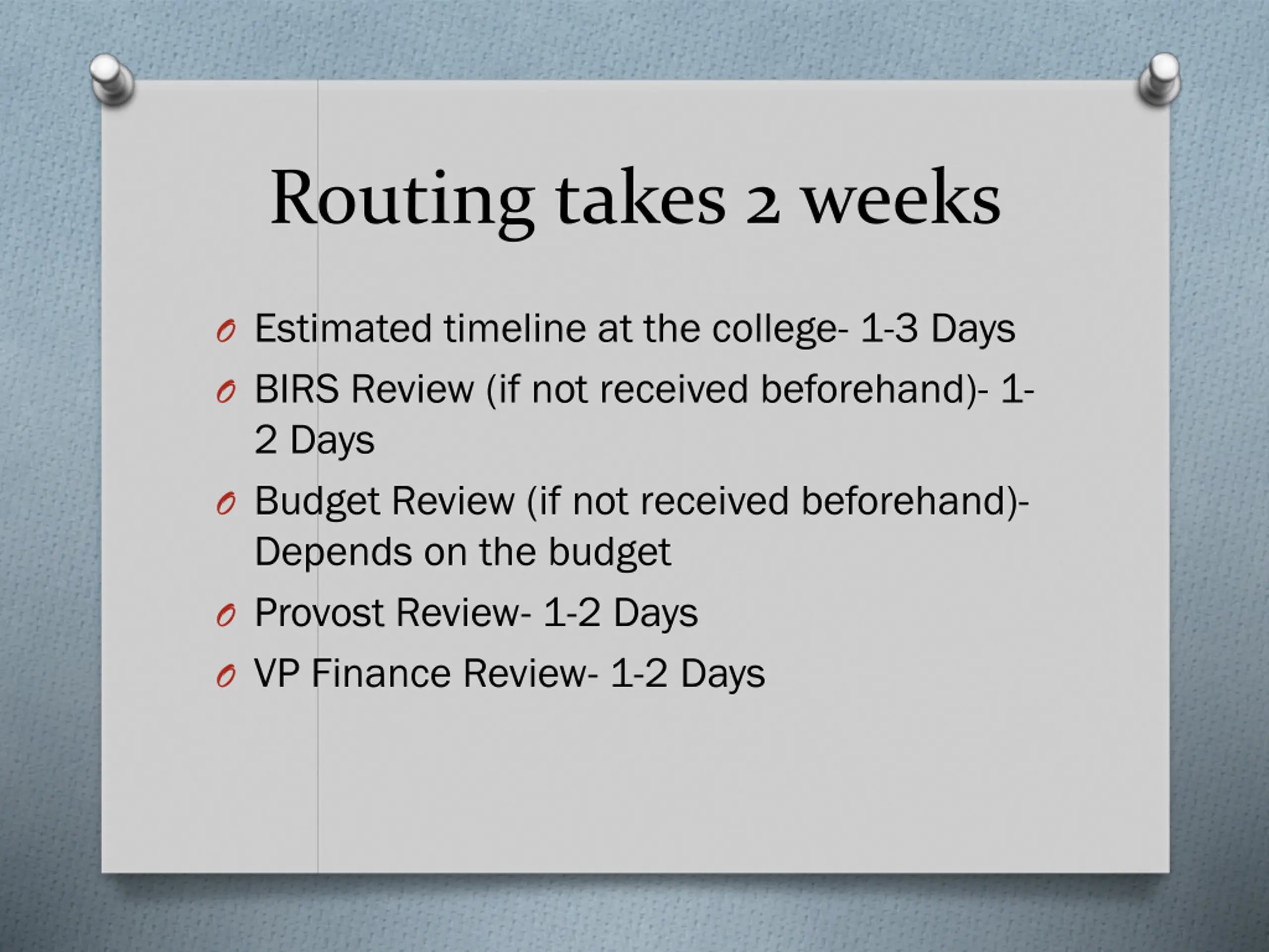 Routing takes 2 weeks O Estimated timeline at the college- 1-3 Days O BIRS Review (if not received beforehand)- 1- 2 Days O Budget Review (if not received beforehand)- Depends on the budget O Provost Review- 1-2 Days O VP Finance Review- 1-2 Days