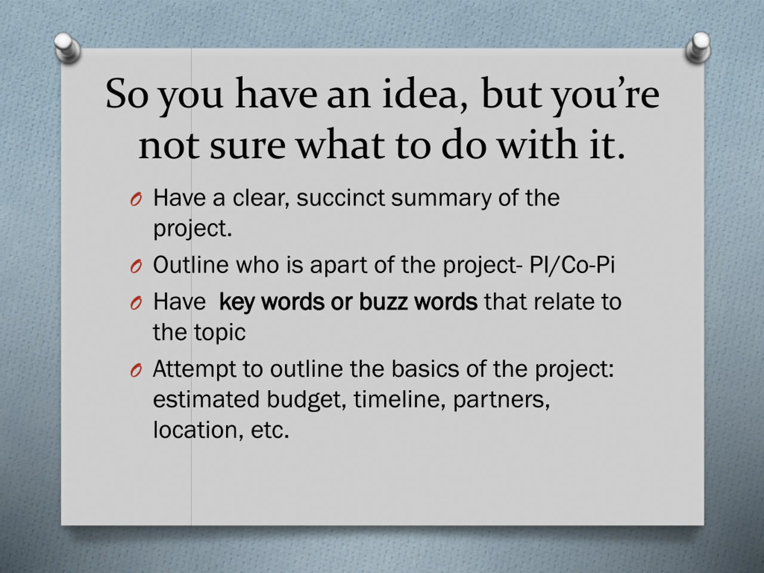 So you have an idea, but youre not sure what to do with it. O Have a clear, succinct summary of the project. O Outline who is apart of the project- PI/Co-Pi O Have key words or buzz words key words or buzz words that relate to the topic O Attempt to outline the basics of the project: estimated budget, timeline, partners, location, etc.