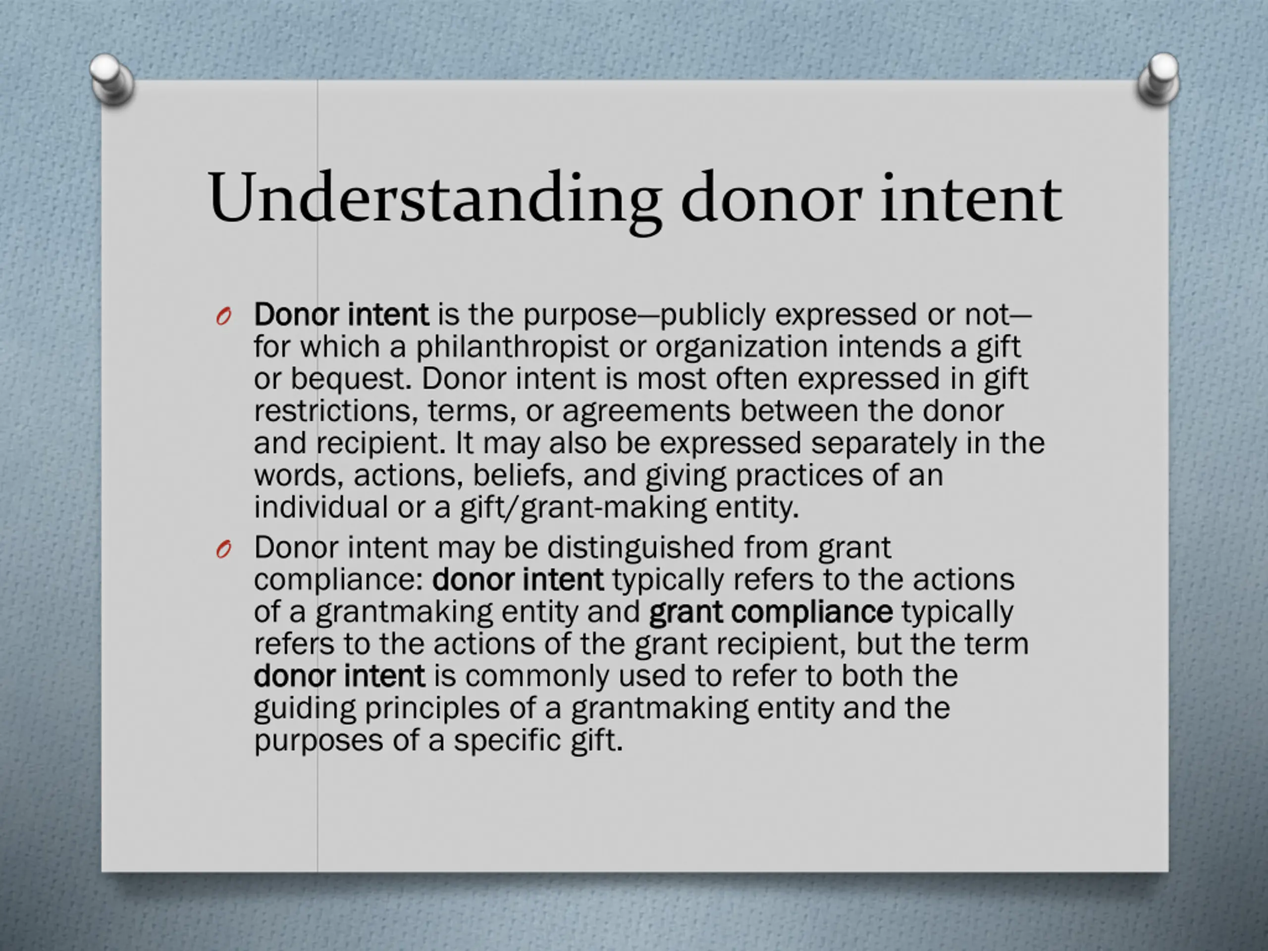 Understanding donor intent O Donor Donor intent for which a philanthropist or organization intends a gift or bequest. Donor intent is most often expressed in gift restrictions, terms, or agreements between the donor and recipient. It may also be expressed separately in the words, actions, beliefs, and giving practices of an individual or a gift/grant-making entity. O Donor intent may be distinguished from grant compliance: donor intent donor intent typically refers to the actions of a grantmaking entity and grant compliance refers to the actions of the grant recipient, but the term donor intent donor intent is commonly used to refer to both the guiding principles of a grantmaking entity and the purposes of a specific gift. intent is the purpose publicly expressed or not grant compliance typically