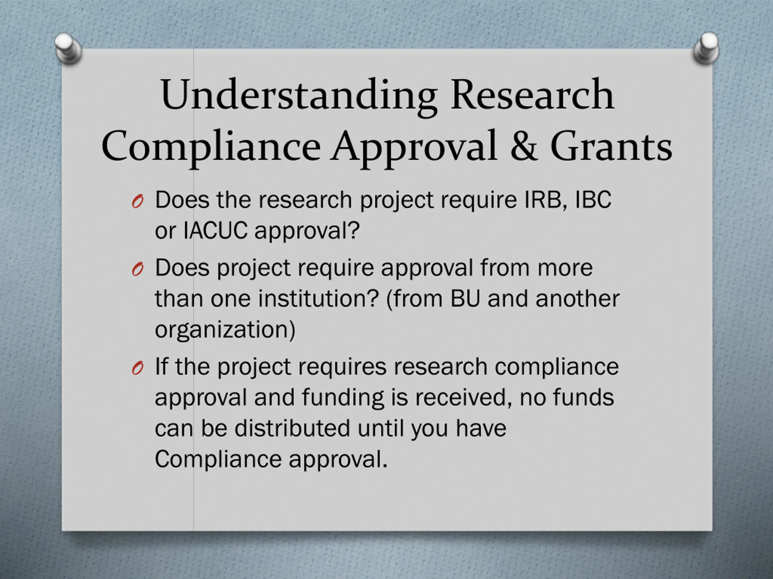 Understanding Research Compliance Approval & Grants O Does the research project require IRB, IBC or IACUC approval? O Does project require approval from more than one institution? (from BU and another organization) O If the project requires research compliance approval and funding is received, no funds can be distributed until you have Compliance approval.