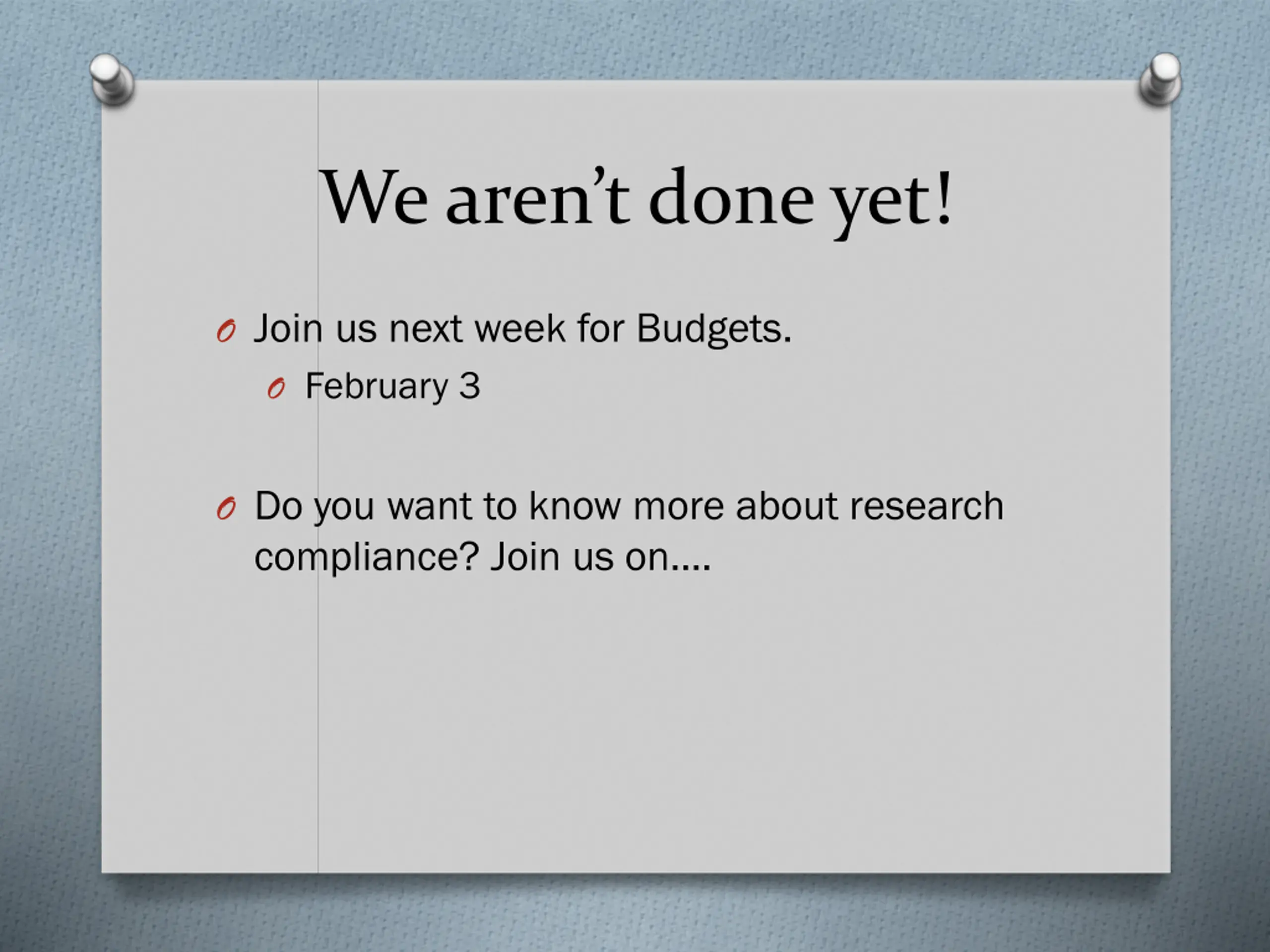 We arent done yet! O Join us next week for Budgets. O February 3 O Do you want to know more about research compliance? Join us on .