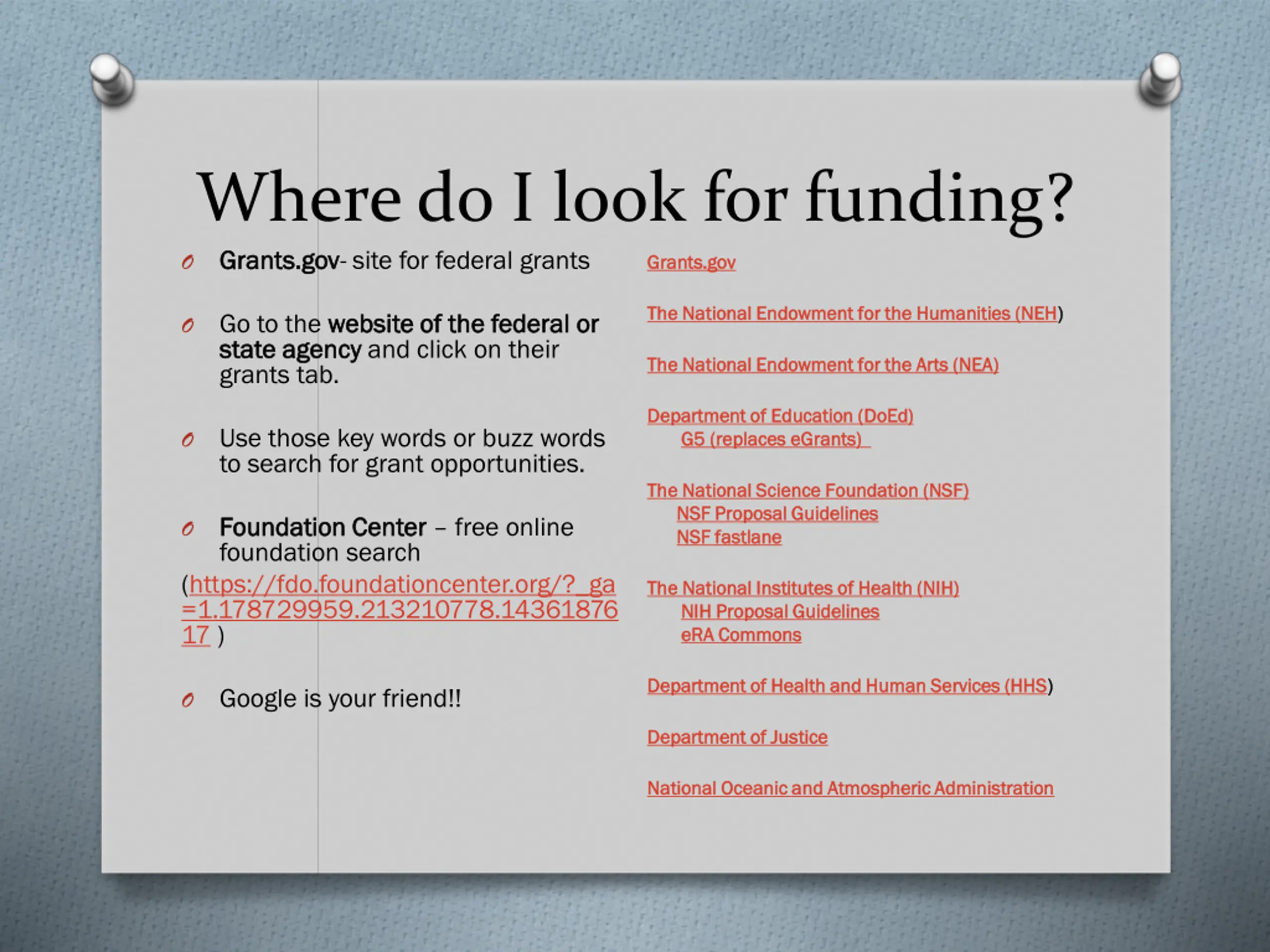 Where do I look for funding? Grants.gov Grants.gov- site for federal grants O Grants.gov Grants.gov The National Endowment for the Humanities (NEH The National Endowment for the Humanities (NEH) ) Go to the website of the federal website of the federal or state agency state agency and click on their grants tab. or O The National Endowment for the Arts (NEA The National Endowment for the Arts (NEA) ) Department of Education ( Department of Education (DoEd G5 (replaces G5 (replaces eGrants DoEd) ) Use those key words or buzz words to search for grant opportunities. O eGrants) ) The National Science Foundation (NSF) The National Science Foundation (NSF) NSF Proposal Guidelines NSF Proposal Guidelines NSF NSF fastlane fastlane Foundation Center Foundation Center free online foundation search (https://fdo.foundationcenter.org/?_ga =1.178729959.213210778.14361876 17 ) O The The National Institutes National Institutes of Health (NIH) NIH Proposal Guidelines NIH Proposal Guidelines eRA eRA Commons Commons of Health (NIH) Department Department of Health and Human Services (HHS of Health and Human Services (HHS) ) Google is your friend!! O Department Department of Justice of Justice National National Oceanic and Atmospheric Administration Oceanic and Atmospheric Administration