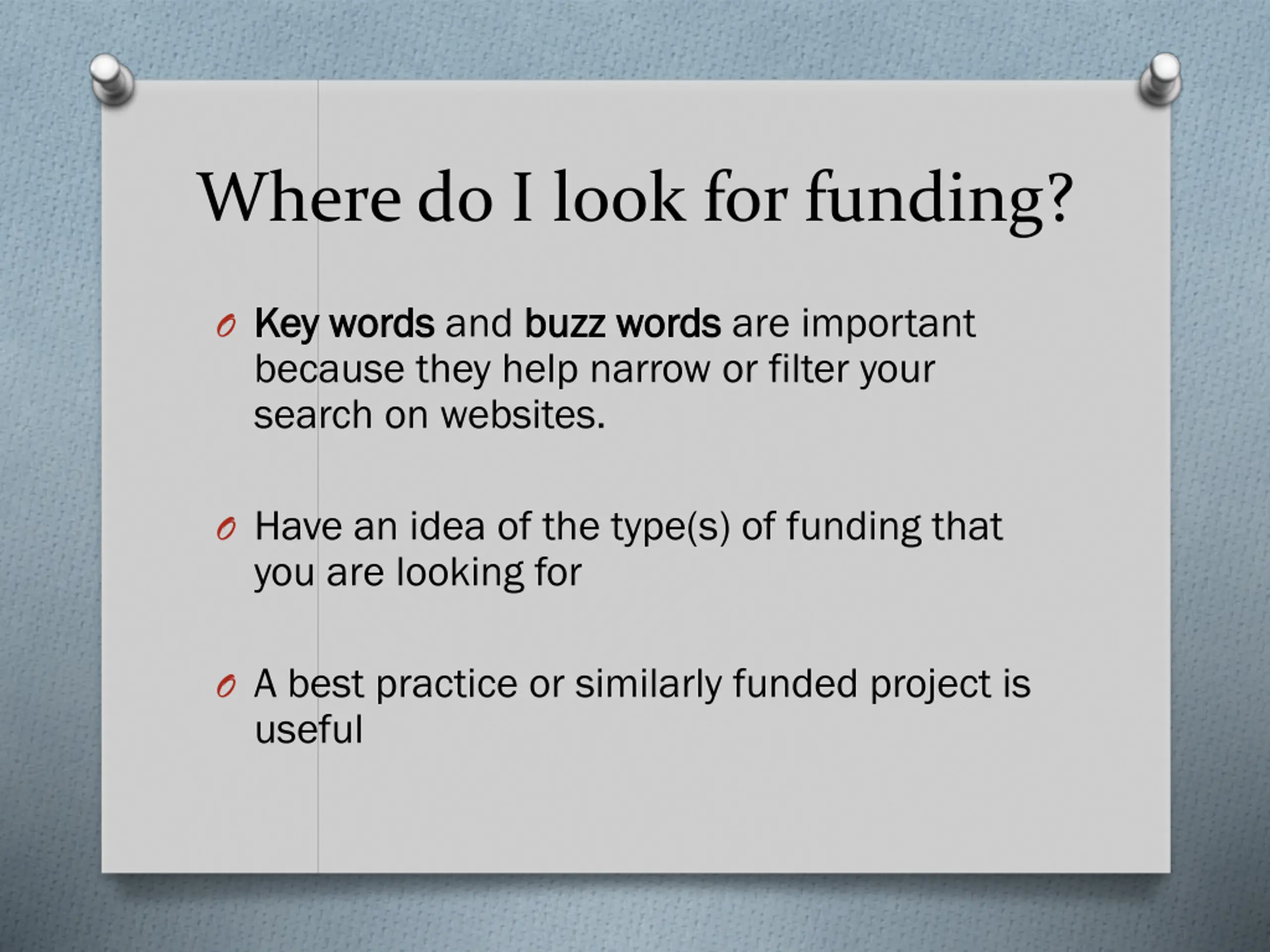 Where do I look for funding? O Key words Key words and buzz words because they help narrow or filter your search on websites. buzz words are important O Have an idea of the type(s) of funding that you are looking for O A best practice or similarly funded project is useful