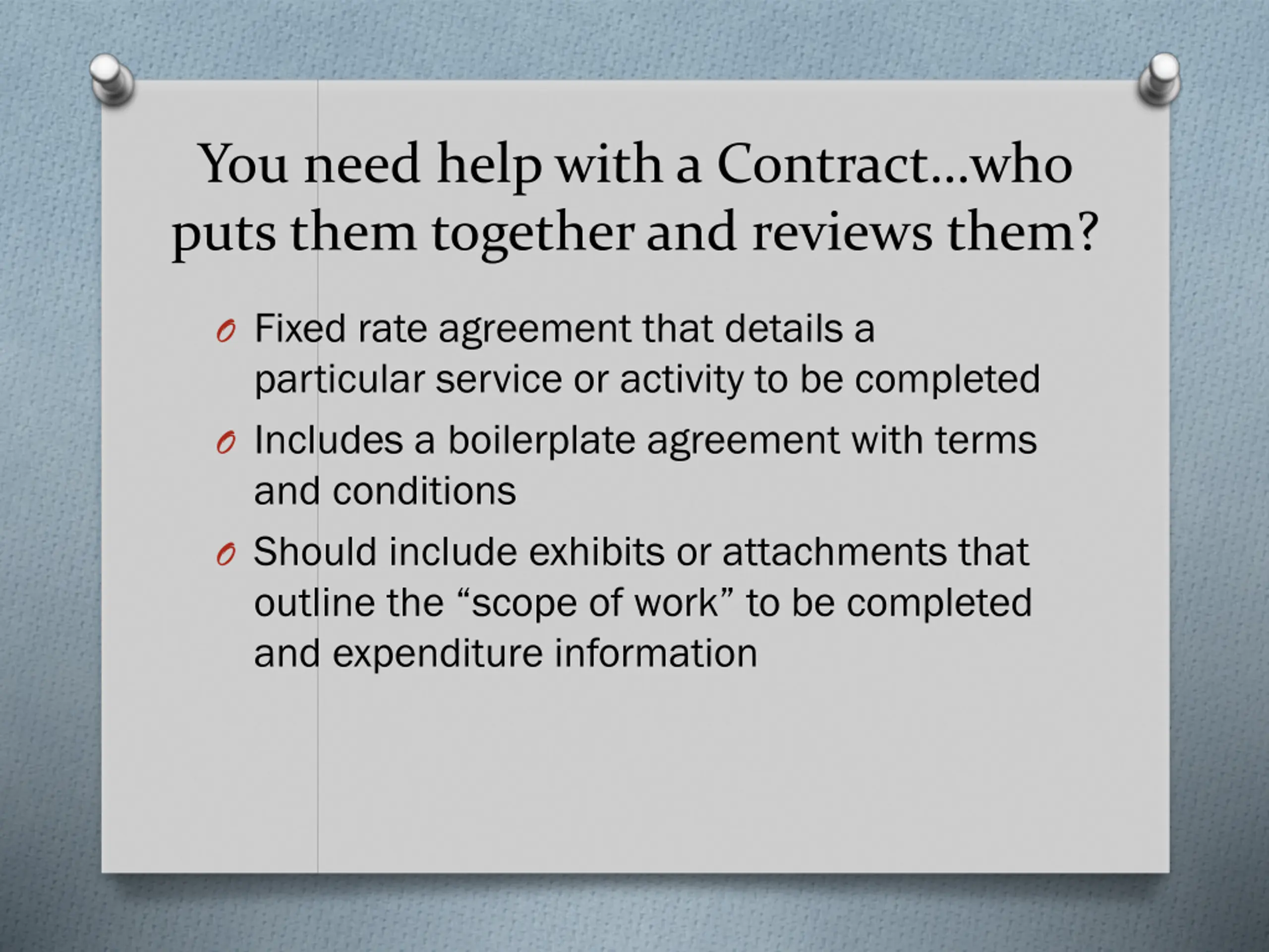 You need help with a Contractwho puts them together and reviews them? O Fixed rate agreement that details a particular service or activity to be completed O Includes a boilerplate agreement with terms and conditions O Should include exhibits or attachments that outline the scope of work to be completed and expenditure information