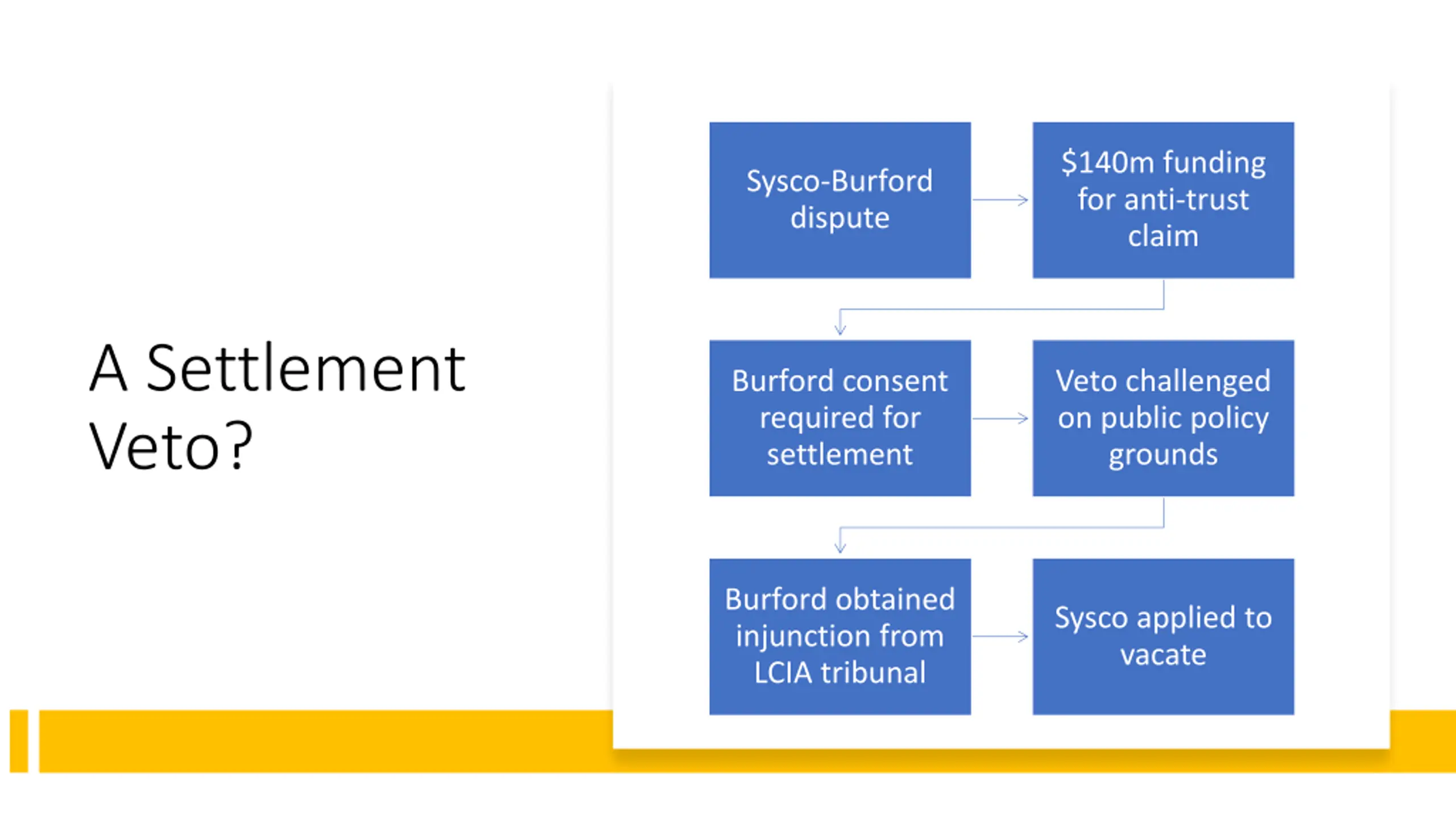 $140m funding for anti-trust claim Sysco-Burford dispute A Settlement Veto? Burford consent required for settlement Veto challenged on public policy grounds Burford obtained injunction from LCIA tribunal Sysco applied to vacate