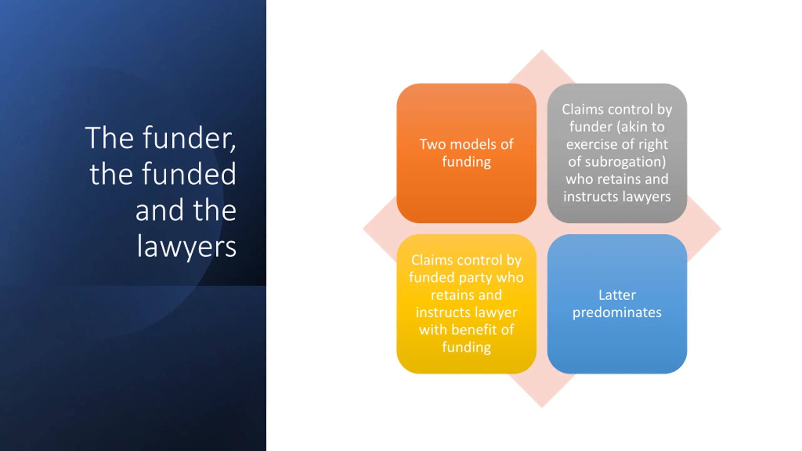 Claims control by funder (akin to exercise of right of subrogation) who retains and instructs lawyers The funder, the funded and the lawyers Two models of funding Claims control by funded party who retains and instructs lawyer with benefit of funding Latter predominates