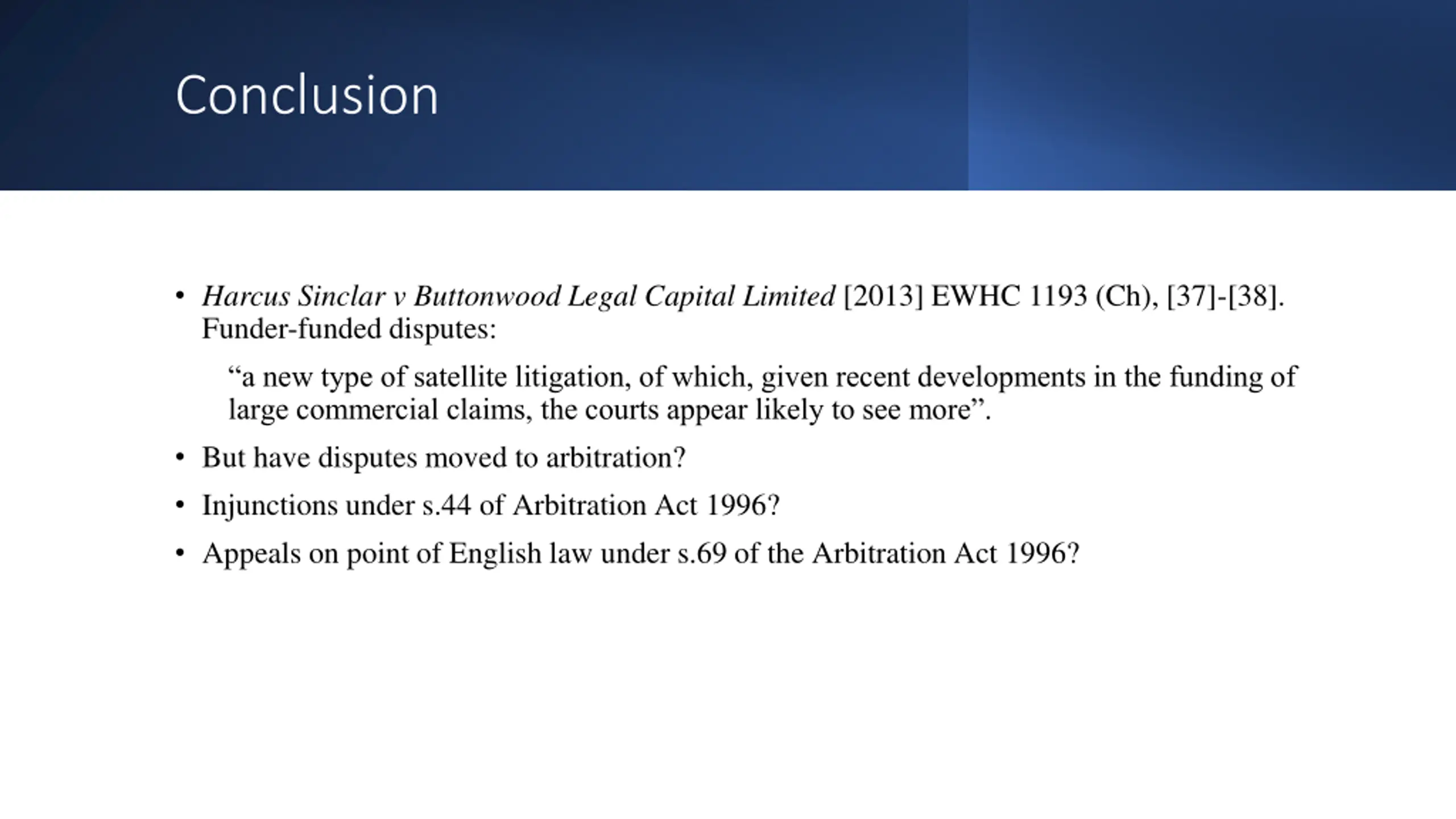 Conclusion Harcus Sinclar v Buttonwood Legal Capital Limited [2013] EWHC 1193 (Ch), [37]-[38]. Funder-funded disputes: a new type of satellite litigation, of which, given recent developments in the funding of large commercial claims, the courts appear likely to see more . But have disputes moved to arbitration? Injunctions under s.44 of Arbitration Act 1996? Appeals on point of English law under s.69 of the Arbitration Act 1996?