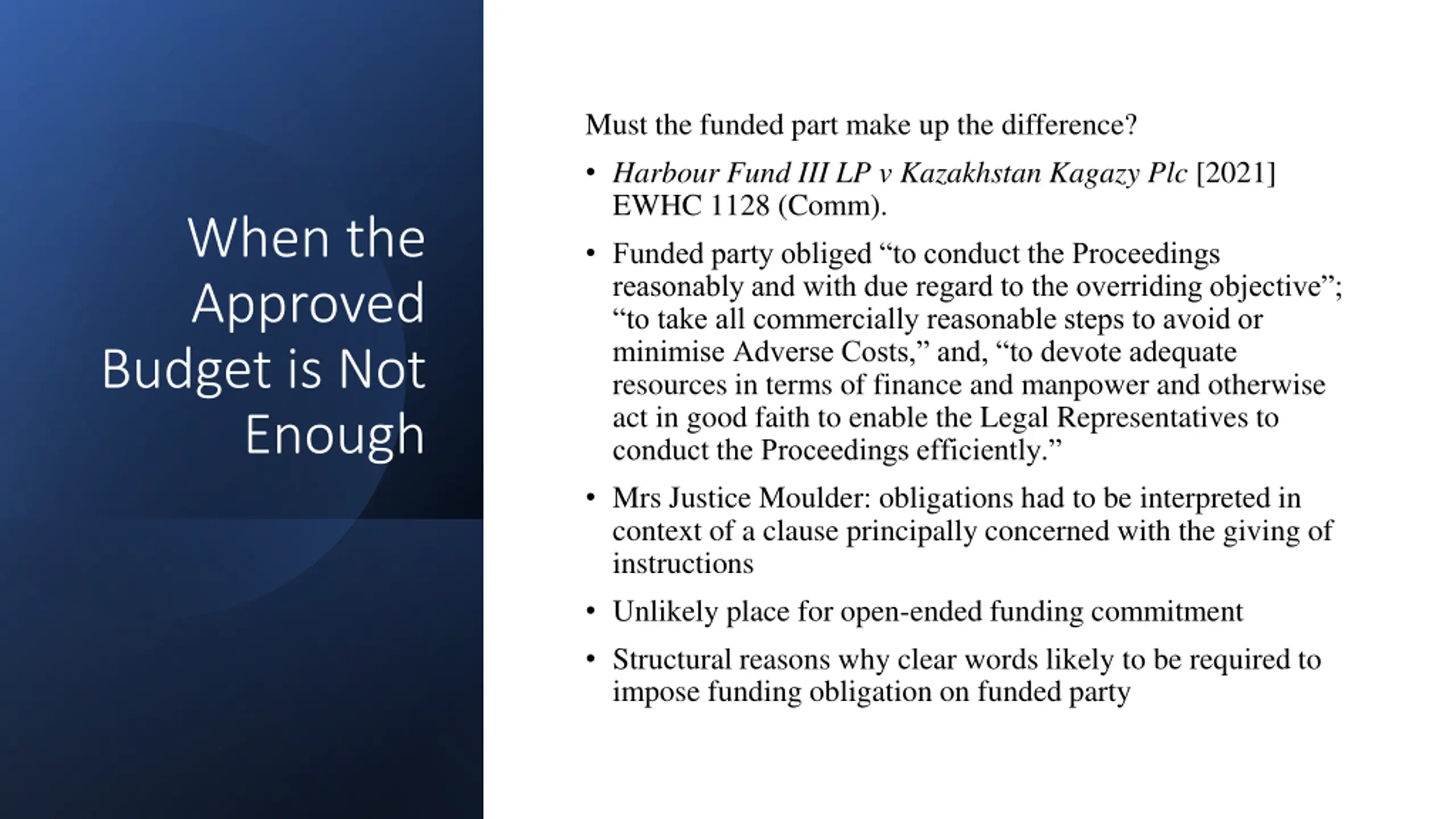 Must the funded part make up the difference? Harbour Fund III LP v Kazakhstan Kagazy Plc [2021] EWHC 1128 (Comm). Funded party obliged to conduct the Proceedings reasonably and with due regard to the overriding objective ; to take all commercially reasonable steps to avoid or minimise Adverse Costs, and, to devote adequate resources in terms of finance and manpower and otherwise act in good faith to enable the Legal Representatives to conduct the Proceedings efficiently. Mrs Justice Moulder: obligations had to be interpreted in context of a clause principally concerned with the giving of instructions Unlikely place for open-ended funding commitment Structural reasons why clear words likely to be required to impose funding obligation on funded party When the Approved Budget is Not Enough