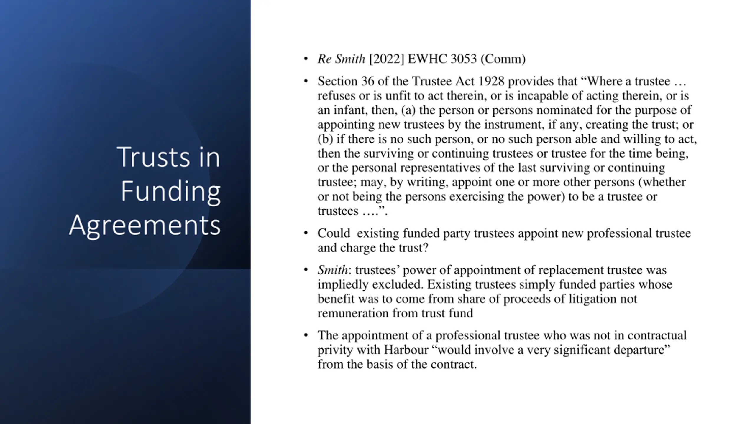 Re Smith [2022] EWHC 3053 (Comm) Section 36 of the Trustee Act 1928 provides that Where a trustee refuses or is unfit to act therein, or is incapable of acting therein, or is an infant, then, (a) the person or persons nominated for the purpose of appointing new trustees by the instrument, if any, creating the trust; or (b) if there is no such person, or no such person able and willing to act, then the surviving or continuing trustees or trustee for the time being, or the personal representatives of the last surviving or continuing trustee; may, by writing, appoint one or more other persons (whether or not being the persons exercising the power) to be a trustee or trustees . . Trusts in Funding Agreements Could existing funded party trustees appoint new professional trustee and charge the trust? Smith: trustees power of appointment of replacement trustee was impliedly excluded. Existing trustees simply funded parties whose benefit was to come from share of proceeds of litigation not remuneration from trust fund The appointment of a professional trustee who was not in contractual privity with Harbour would involve a very significant departure from the basis of the contract.