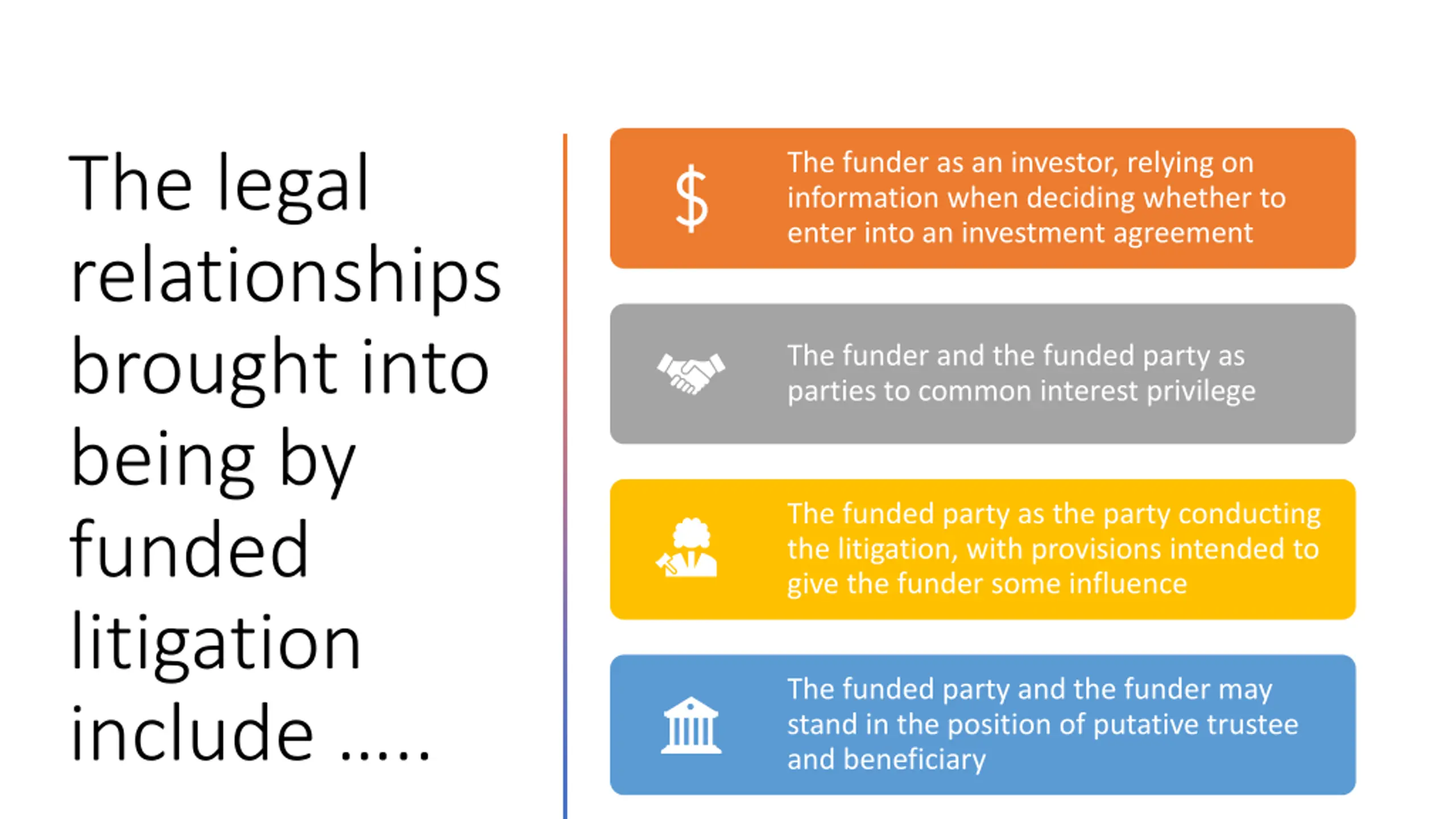 The legal relationships brought into being by funded litigation include .. The funder as an investor, relying on information when deciding whether to enter into an investment agreement The funder and the funded party as parties to common interest privilege The funded party as the party conducting the litigation, with provisions intended to give the funder some influence The funded party and the funder may stand in the position of putative trustee and beneficiary