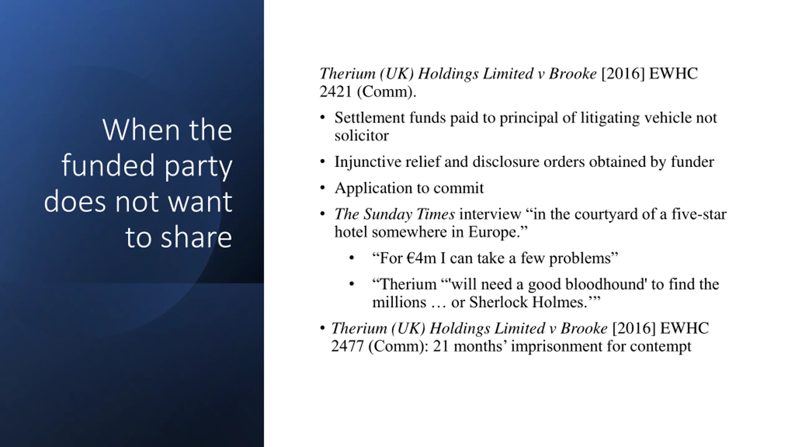 Therium (UK) Holdings Limited v Brooke [2016] EWHC 2421 (Comm). Settlement funds paid to principal of litigating vehicle not solicitor Injunctive relief and disclosure orders obtained by funder Application to commit The Sunday Times interview in the courtyard of a five-star hotel somewhere in Europe. For 4m I can take a few problems Therium 'will need a good bloodhound' to find the millions or Sherlock Holmes. Therium (UK) Holdings Limited v Brooke [2016] EWHC 2477 (Comm): 21 months imprisonment for contempt When the funded party does not want to share