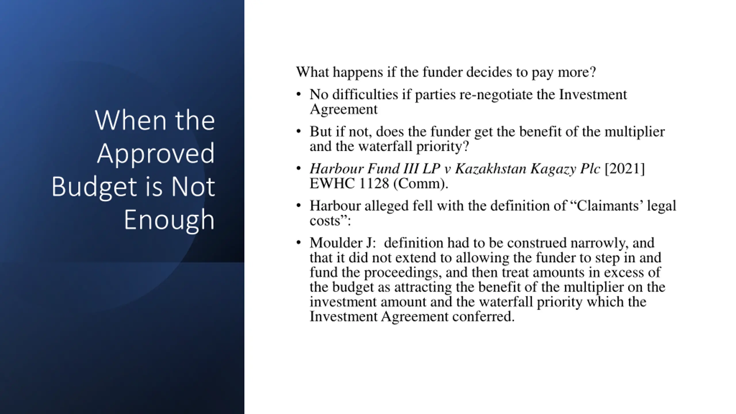 What happens if the funder decides to pay more? No difficulties if parties re-negotiate the Investment Agreement But if not, does the funder get the benefit of the multiplier and the waterfall priority? Harbour Fund III LP v Kazakhstan Kagazy Plc [2021] EWHC 1128 (Comm). Harbour alleged fell with the definition of Claimants legal costs : Moulder J: definition had to be construed narrowly, and that it did not extend to allowing the funder to step in and fund the proceedings, and then treat amounts in excess of the budget as attracting the benefit of the multiplier on the investment amount and the waterfall priority which the Investment Agreement conferred. When the Approved Budget is Not Enough