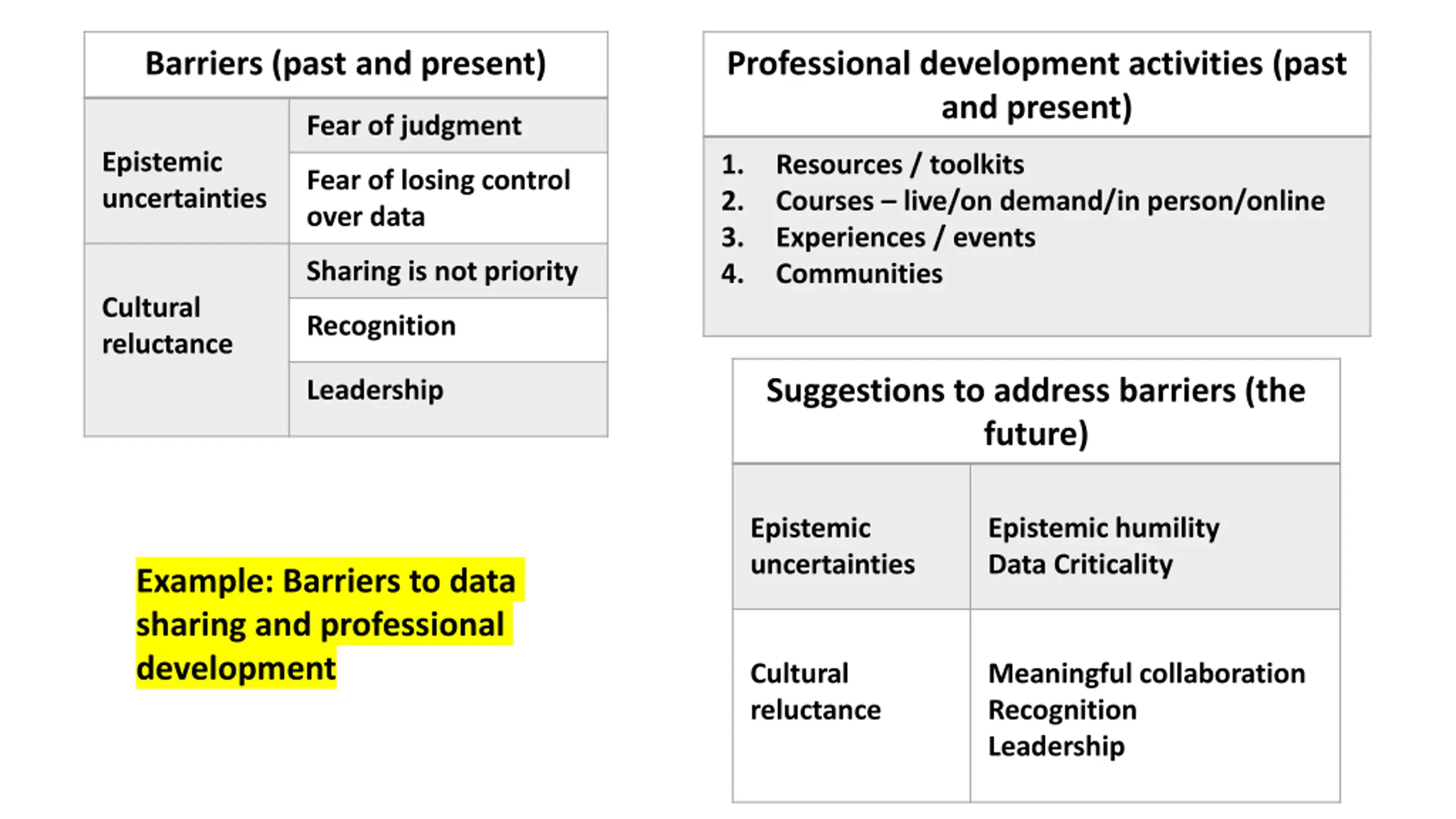 - Barriers (past and present) Professional development activities (past and present) Fear of judgment Epistemic uncertainties 1. 2. 3. 4. Resources / toolkits Courses live/on demand/in person/online Experiences / events Communities Fear of losing control over data Sharing is not priority Cultural reluctance Recognition Suggestions to address barriers (the future) Leadership Epistemic uncertainties Epistemic humility Data Criticality Example: Barriers to data sharing and professional development Cultural reluctance Meaningful collaboration Recognition Leadership