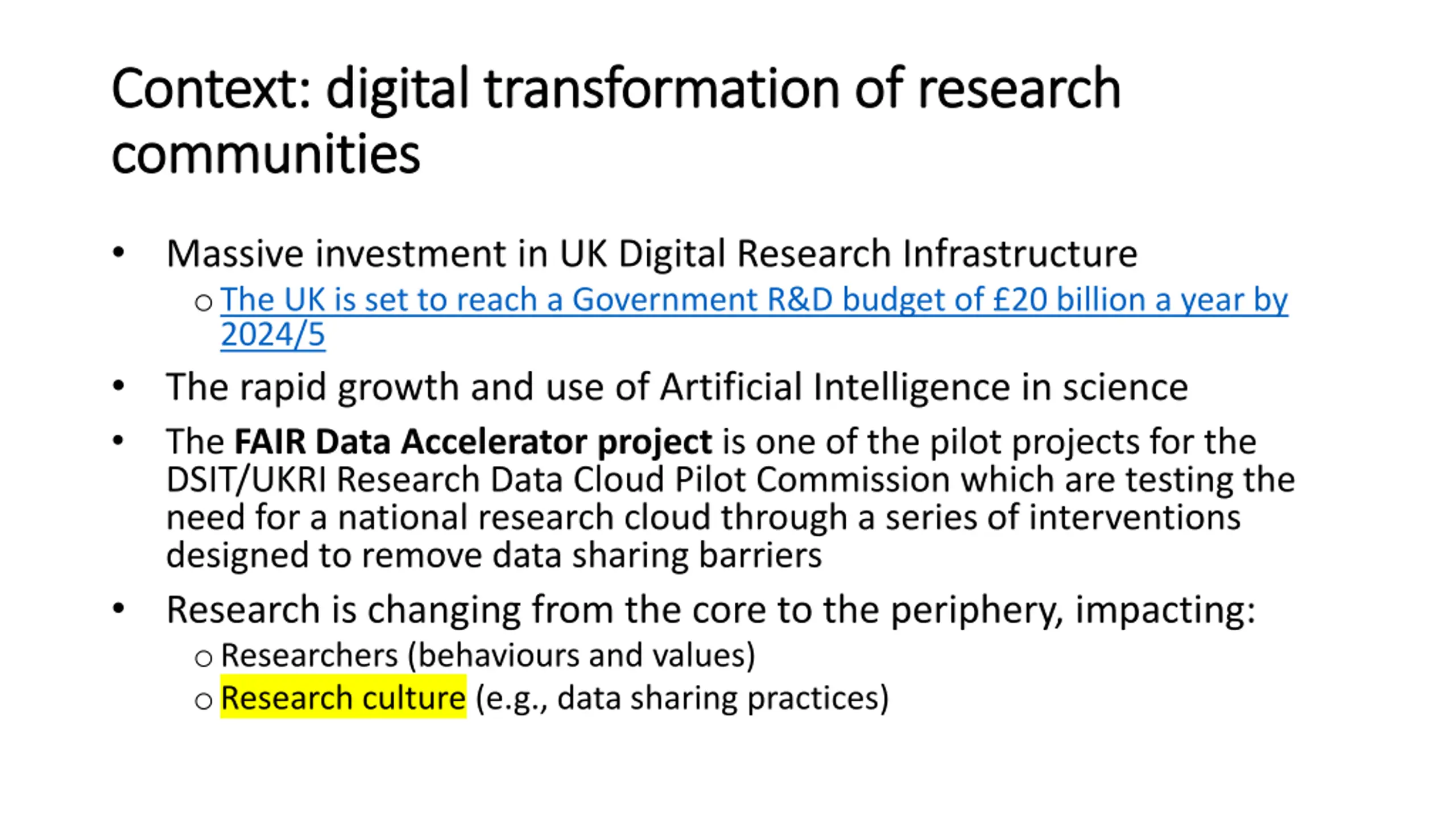 - Context: digital transformation of research Context: digital transformation of research communities communities Massive investment in UK Digital Research Infrastructure oThe UK is set to reach a Government R&D budget of 20 billion a year by 2024/5 The rapid growth and use of Artificial Intelligence in science The FAIR Data Accelerator project is one of the pilot projects for the DSIT/UKRI Research Data Cloud Pilot Commission which are testing the need for a national research cloud through a series of interventions designed to remove data sharing barriers Research is changing from the core to the periphery, impacting: oResearchers (behaviours and values) oResearch culture (e.g., data sharing practices)