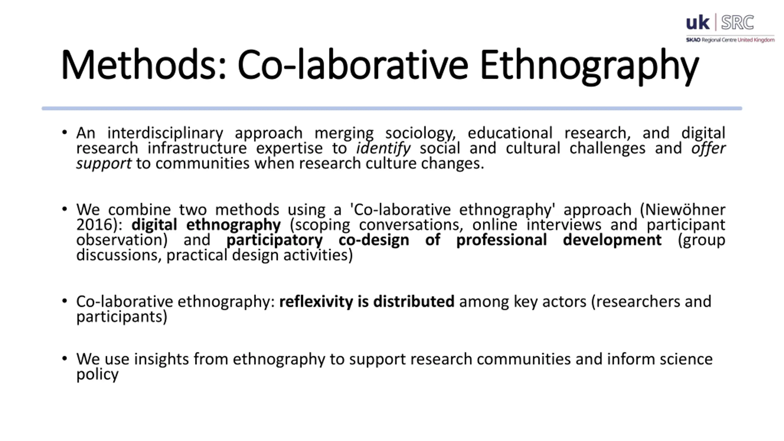 - Methods: Co Methods: Co- -laborative laborative Ethnography Ethnography An interdisciplinary approach merging sociology, educational research, and digital research infrastructure expertise to identify social and cultural challenges and offer support to communities when research culture changes. We combine two methods using a 'Co-laborative ethnography' approach (Niew hner 2016): digital ethnography (scoping conversations, online interviews and participant observation) and participatory co-design of professional development (group discussions, practical design activities) Co-laborative ethnography: reflexivity is distributed among key actors (researchers and participants) We use insights from ethnography to support research communities and inform science policy