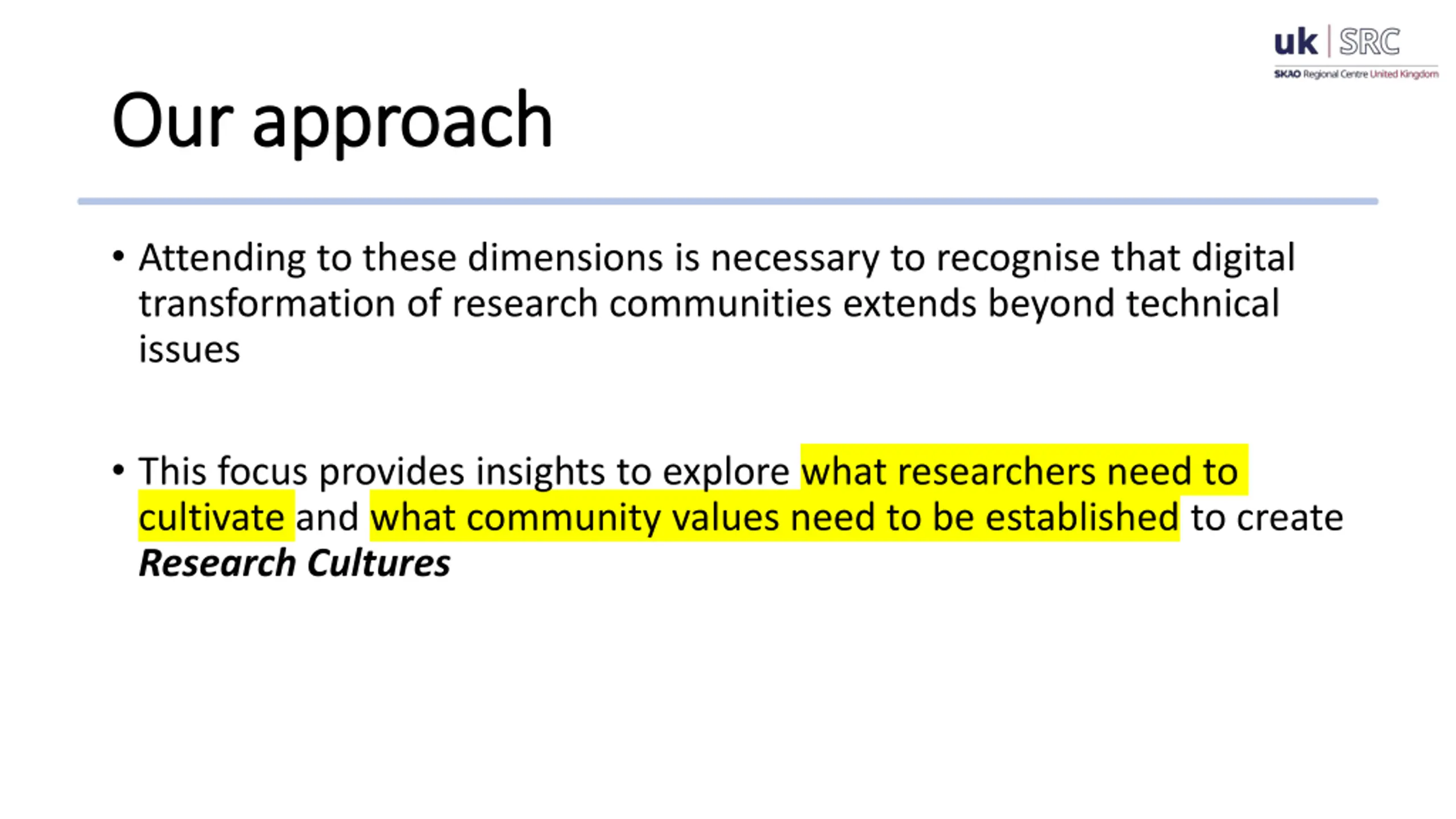 - Our approach Our approach Attending to these dimensions is necessary to recognise that digital transformation of research communities extends beyond technical issues This focus provides insights to explore what researchers need to cultivate and what community values need to be established to create Research Cultures