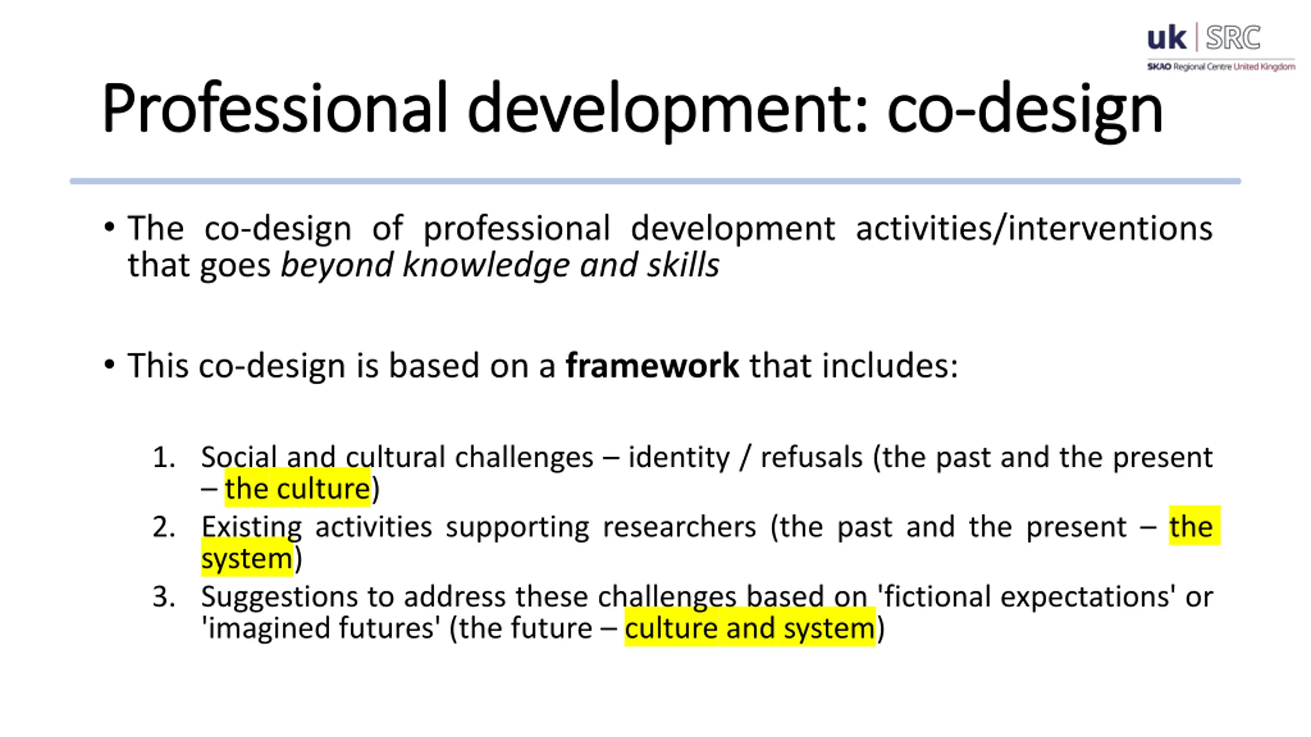 - Professional development: co Professional development: co- -design design The co-design of professional development activities/interventions that goes beyond knowledge and skills This co-design is based on a framework that includes: 1. Social and cultural challenges identity / refusals (the past and the present the culture) 2. Existing activities supporting researchers (the past and the present the system) 3. Suggestions to address these challenges based on 'fictional expectations' or 'imagined futures' (the future culture and system)