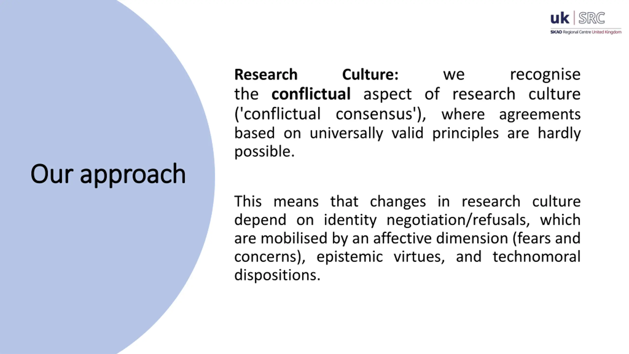 - we recognise Research the conflictual aspect of research culture ('conflictual consensus'), where agreements based on universally valid principles are hardly possible. Culture: Our approach Our approach This means that changes in research culture depend on identity negotiation/refusals, which are mobilised by an affective dimension (fears and concerns), epistemic virtues, and technomoral dispositions.