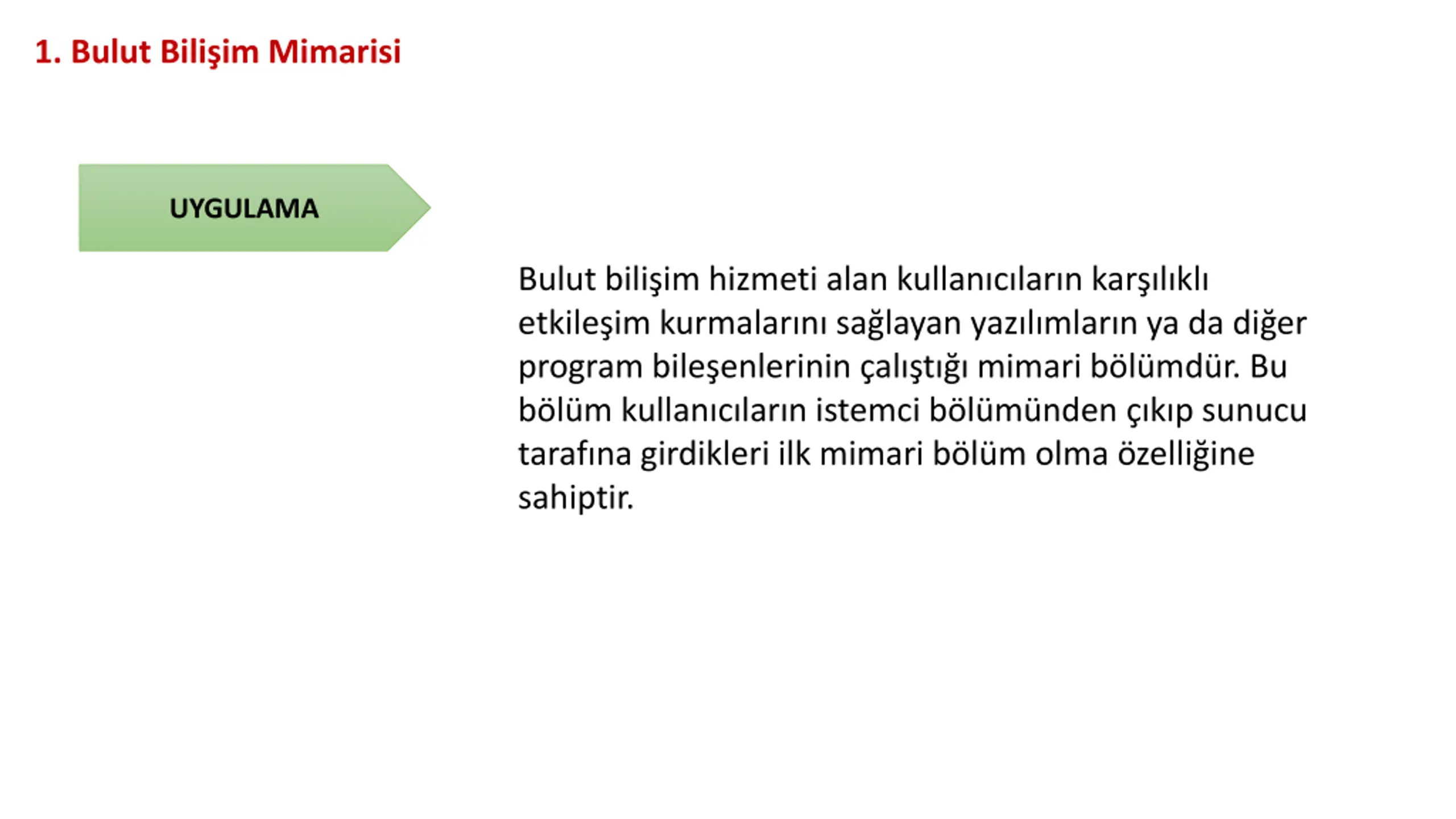 1. Bulut Biliim Mimarisi UYGULAMA Bulut bili im hizmeti alan kullan c lar n kar l kl etkile im kurmalar n sa layan yaz l mlar n ya da di er program bile enlerinin al t mimari b l md r. Bu b l m kullan c lar n istemci b l m nden k p sunucu taraf na girdikleri ilk mimari b l m olma zelli ine sahiptir.