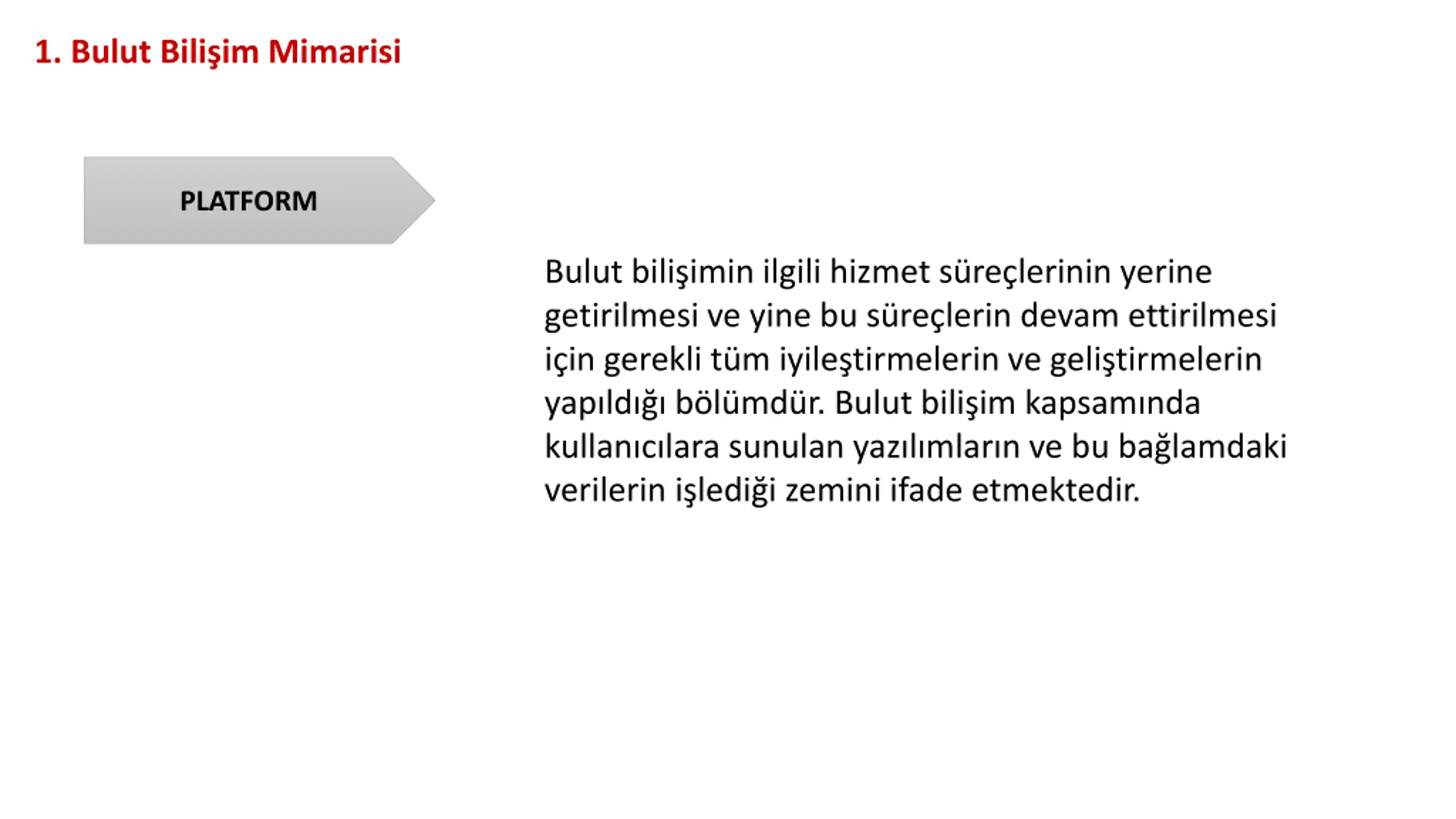 1. Bulut Biliim Mimarisi PLATFORM Bulut bili imin ilgili hizmet s re lerinin yerine getirilmesi ve yine bu s re lerin devam ettirilmesi i in gerekli t m iyile tirmelerin ve geli tirmelerin yap ld b l md r. Bulut bili im kapsam nda kullan c lara sunulan yaz l mlar n ve bu ba lamdaki verilerin i ledi i zemini ifade etmektedir.