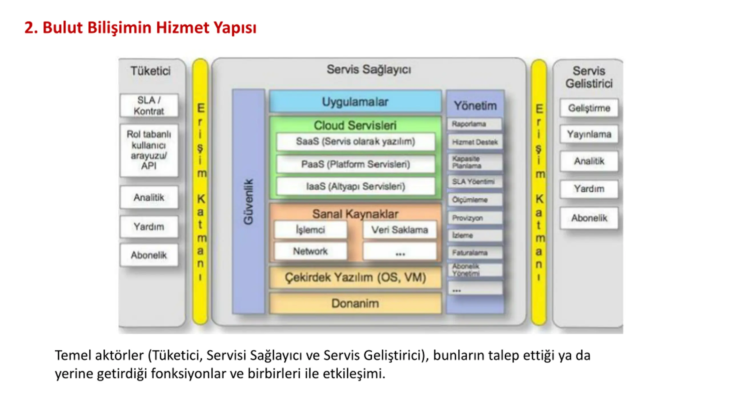 SERVS SALAYICI (Hizmet Sa lay c lar) ekirdek yaz l m n st nde bilgi i leme, veri saklama, ileti ima lar gibi sanalla t r lm kaynaklar bulunmaktad r. Sanalla t rma Bulut Servislerinin (otomatik provizyonlama, kulland k a de ve elastikiyet ile beraber) en belirgin zelli idir. Bu yap n n sorunsuz al abilmesi i in servis sa lay c n n temel y netim servislerini olu turmas gerekmektedir. Bunlar sa tarafta Y netim ba l alt nda g sterilmektedir. Kullan c n naboneli indenkaynaklar natanmas na, sisteme eklenen yeni donan m nkullan mahaz r hale getirilmesine kadar t m provizyon s re lerinin otomatik i ak lar halinde hayata ge irilmi olmas en nemli fonksiyonlardan biridir. Kapasite planlamas nda yetkinlik, kaynaklar nkullan c n n talebi durumunda verilip al nabilmesi (elastiklik) i in nemlidir.
