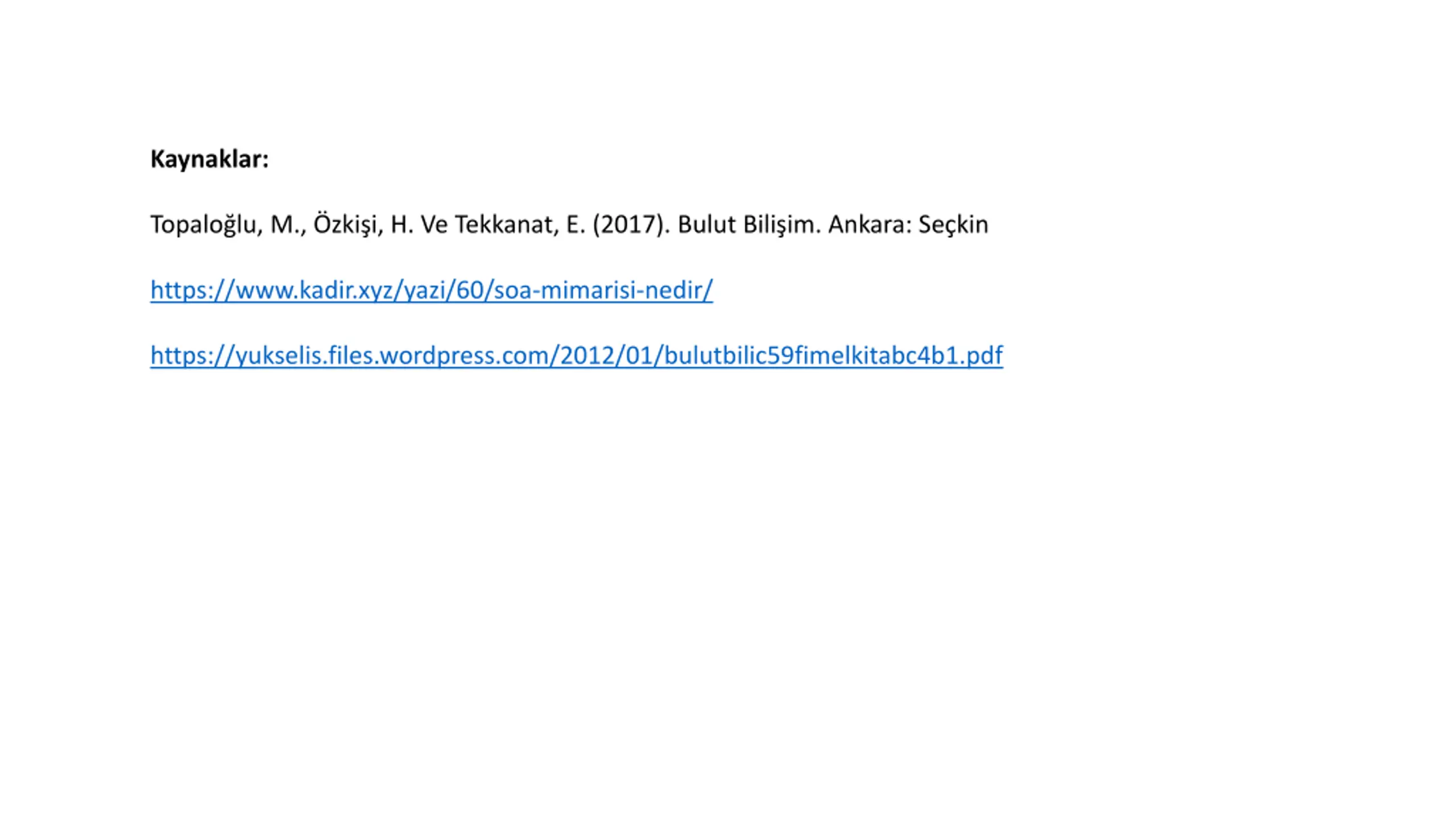 Kaynaklar: Topalo lu, M., zki i, H. Ve Tekkanat, E. (2017). Bulut Bili im. Ankara: Se kin https://www.kadir.xyz/yazi/60/soa-mimarisi-nedir/ https://yukselis.files.wordpress.com/2012/01/bulutbilic59fimelkitabc4b1.pdf