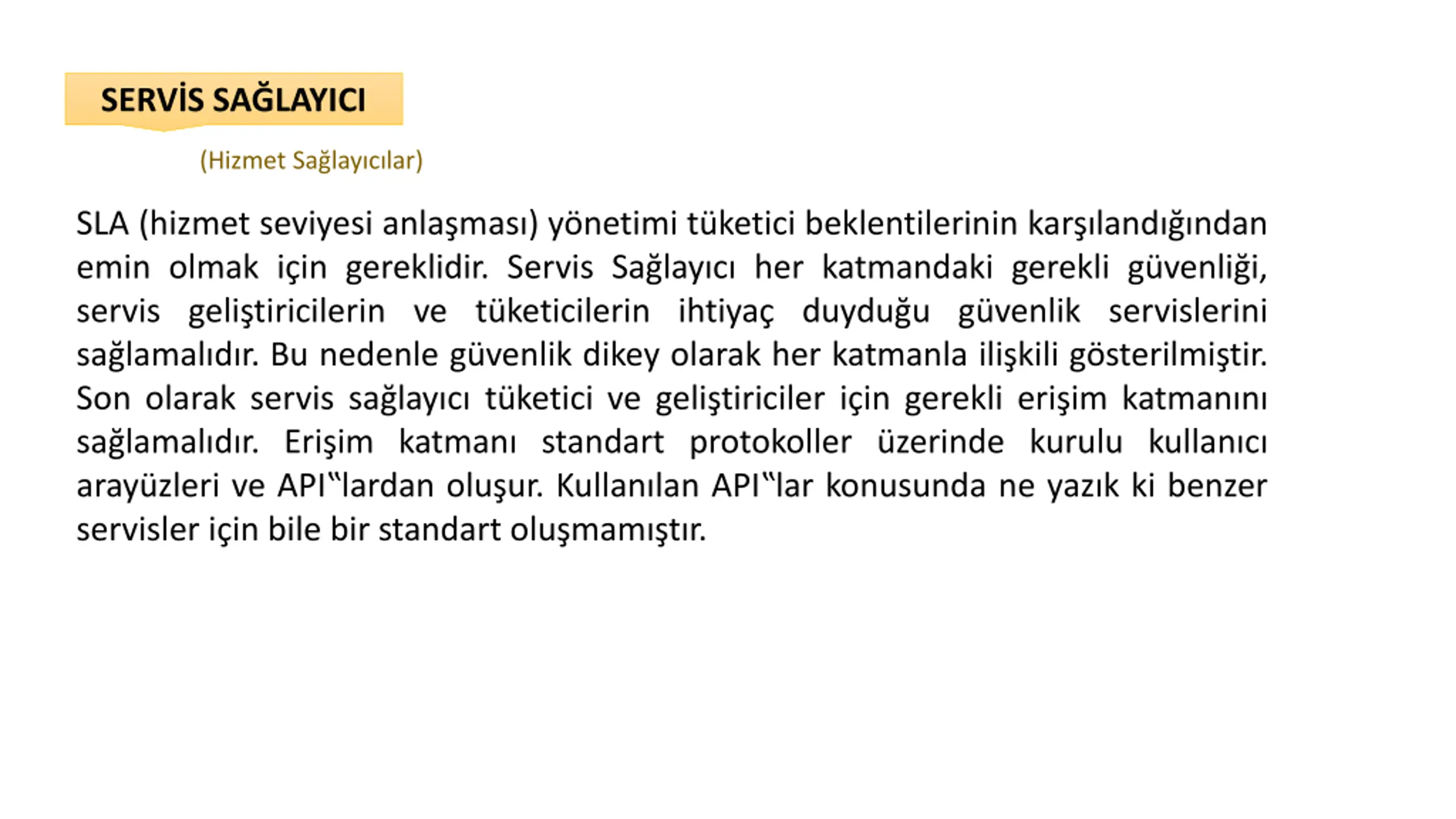 SERVS SALAYICI (Hizmet Sa lay c lar) SLA (hizmet seviyesi anla mas ) y netimi t ketici beklentilerinin kar land ndan emin olmak i in gereklidir. Servis Sa lay c her katmandaki gerekli g venli i, servis geli tiricilerin ve t keticilerin ihtiya duydu u g venlik servislerini sa lamal d r. Bu nedenle g venlik dikey olarak her katmanla ili kilig sterilmi tir. Son olarak servis sa lay c t ketici ve geli tiriciler i in gerekli eri imkatman n sa lamal d r. Eri imkatman standart protokoller zerinde kurulu kullan c aray zleri ve API lardanolu ur. Kullan lanAPI lar konusunda ne yaz k ki benzer servisler i in bile bir standart olu mam t r.