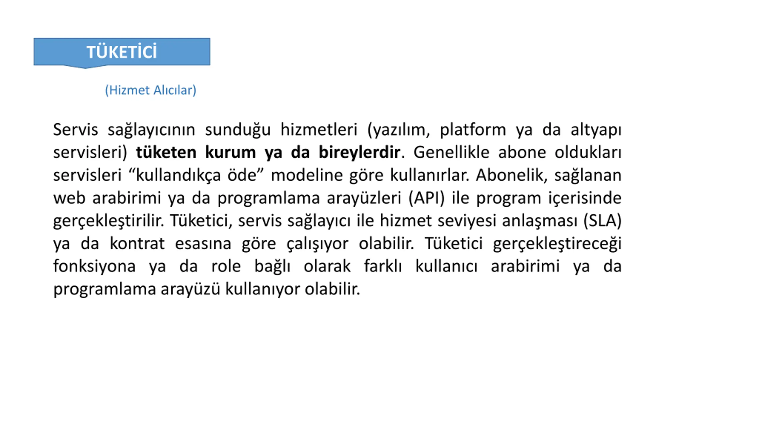 TKETC (Hizmet Al c lar) Servis sa lay c n nsundu u hizmetleri (yaz l m, platform ya da altyap servisleri) t keten kurum ya da bireylerdir. Genellikle abone olduklar servisleri kulland k a de modeline g re kullan rlar. Abonelik, sa lanan web arabirimi ya da programlama aray zleri (API) ile program i erisinde ger ekle tirilir. T ketici, servis sa lay c ile hizmet seviyesi anla mas (SLA) ya da kontrat esas na g re al yor olabilir. T ketici ger ekle tirece i fonksiyona ya da role ba l olarak farkl kullan c arabirimi ya da programlama aray z kullan yor olabilir.