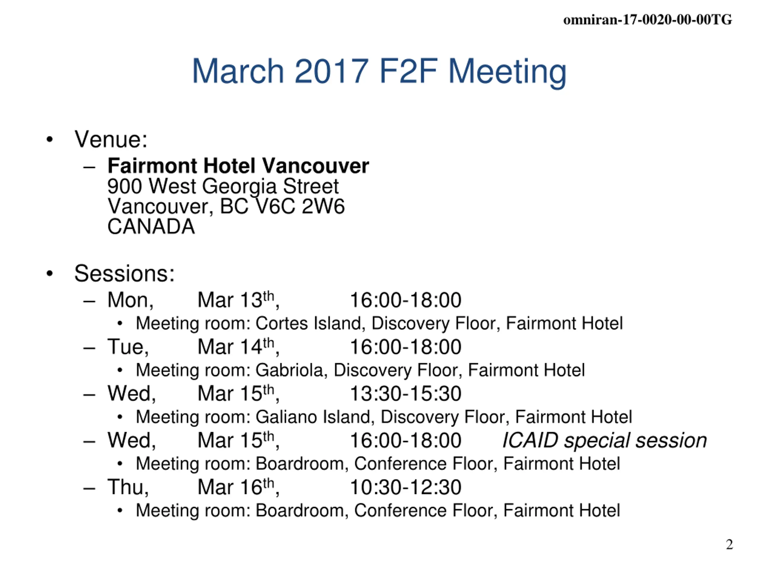 omniran-17-0020-00-00TG March 2017 F2F Meeting Venue: Fairmont Hotel Vancouver 900 West Georgia Street Vancouver, BC V6C 2W6 CANADA Sessions: Mon, Mar 13th, 16:00-18:00 Meeting room: Cortes Island, Discovery Floor, Fairmont Hotel Tue, Mar 14th, 16:00-18:00 Meeting room: Gabriola, Discovery Floor, Fairmont Hotel Wed, Mar 15th, 13:30-15:30 Meeting room: Galiano Island, Discovery Floor, Fairmont Hotel Wed, Mar 15th, 16:00-18:00 Meeting room: Boardroom, Conference Floor, Fairmont Hotel Thu, Mar 16th, 10:30-12:30 Meeting room: Boardroom, Conference Floor, Fairmont Hotel ICAID special session 2