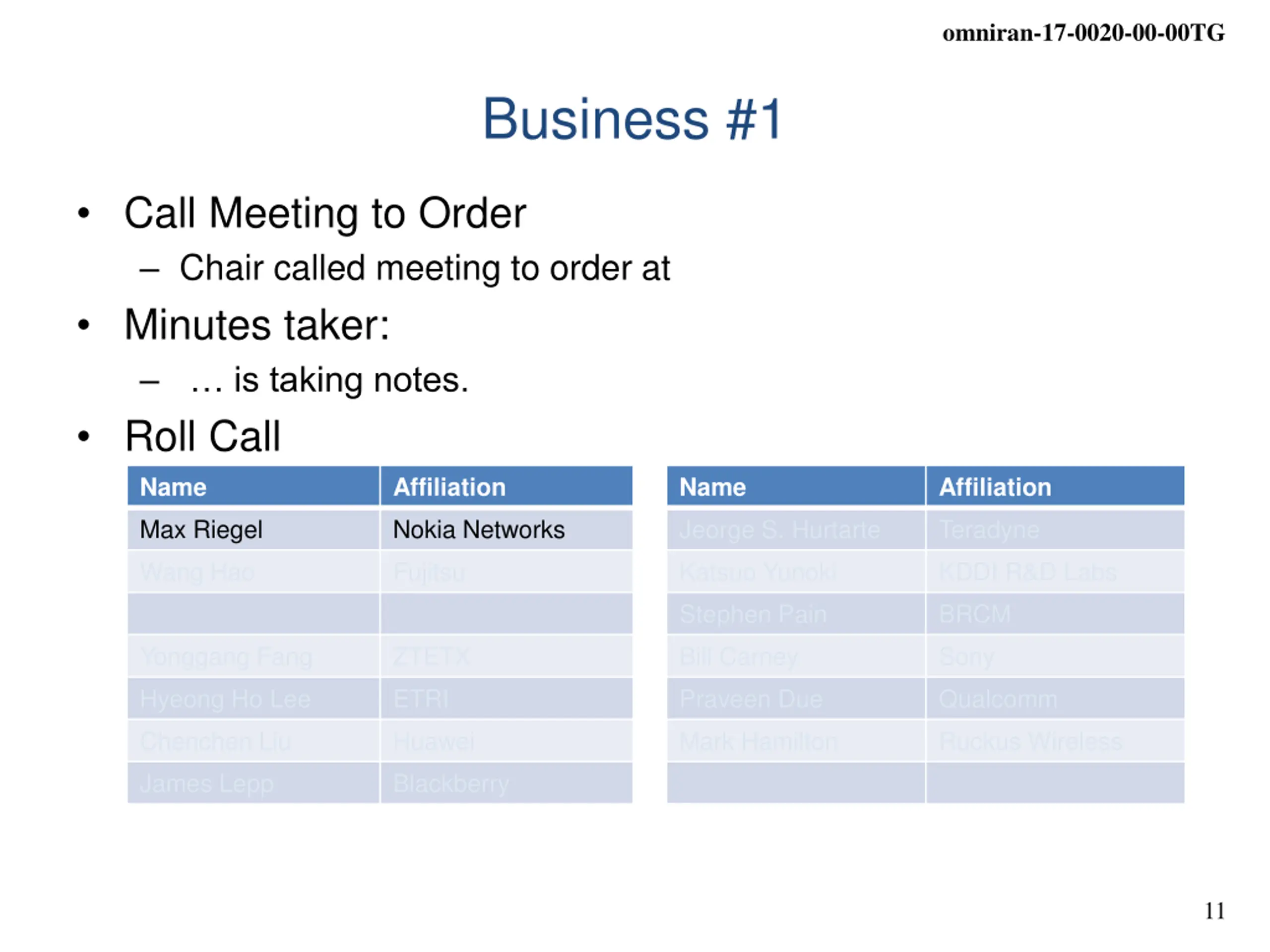 omniran-17-0020-00-00TG Business #1 Call Meeting to Order Chair called meeting to order at Minutes taker: is taking notes. Roll Call Name Affiliation Name Affiliation Max Riegel Nokia Networks Jeorge S. Hurtarte Teradyne Wang Hao Fujitsu Katsuo Yunoki KDDI R&D Labs Stephen Pain BRCM Yonggang Fang ZTETX Bill Carney Sony Hyeong Ho Lee ETRI Praveen Due Qualcomm Chenchen Liu Huawei Mark Hamilton Ruckus Wireless James Lepp Blackberry 11