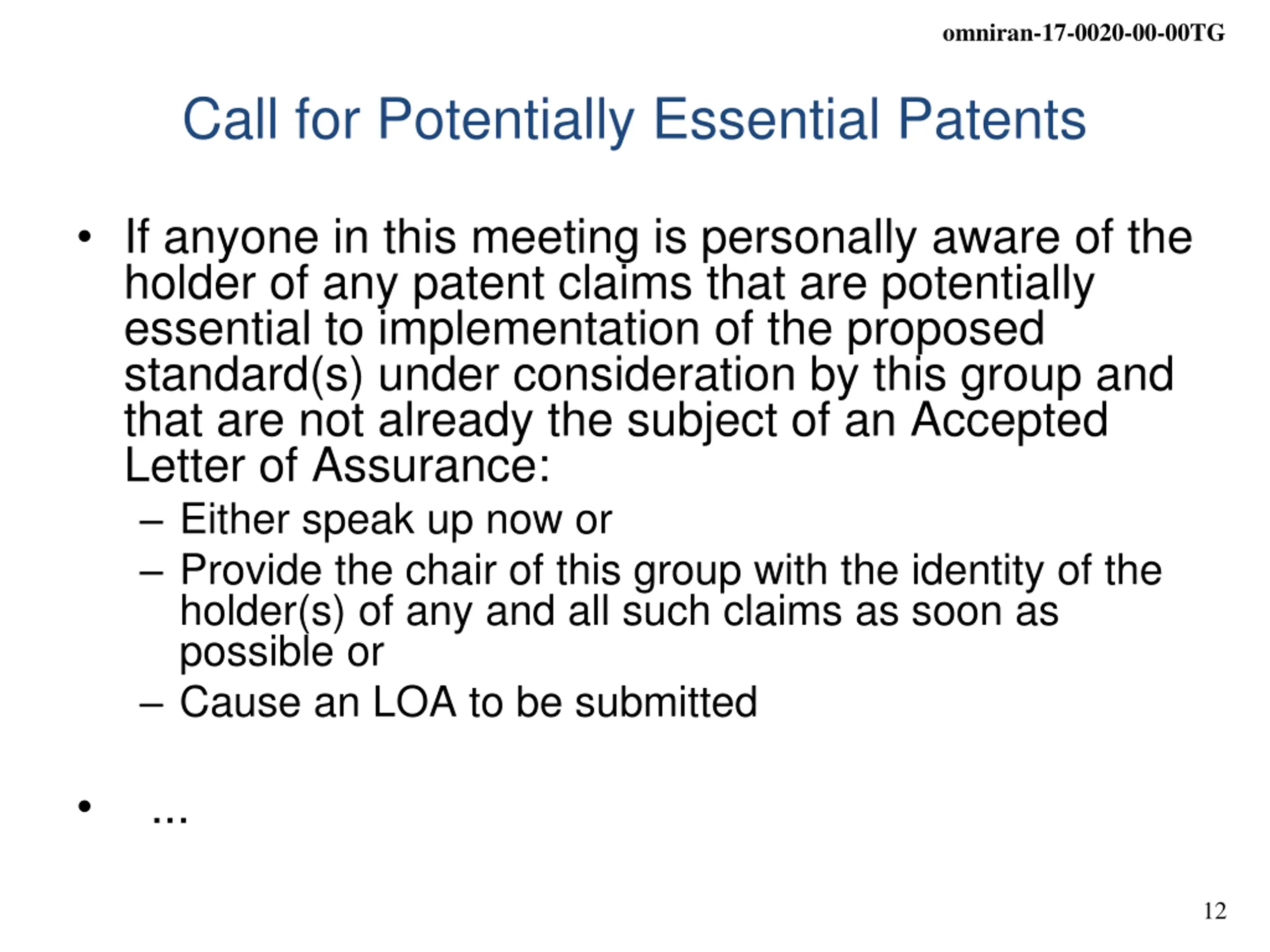 omniran-17-0020-00-00TG Call for Potentially Essential Patents If anyone in this meeting is personally aware of the holder of any patent claims that are potentially essential to implementation of the proposed standard(s) under consideration by this group and that are not already the subject of an Accepted Letter of Assurance: Either speak up now or Provide the chair of this group with the identity of the holder(s) of any and all such claims as soon as possible or Cause an LOA to be submitted ... 12