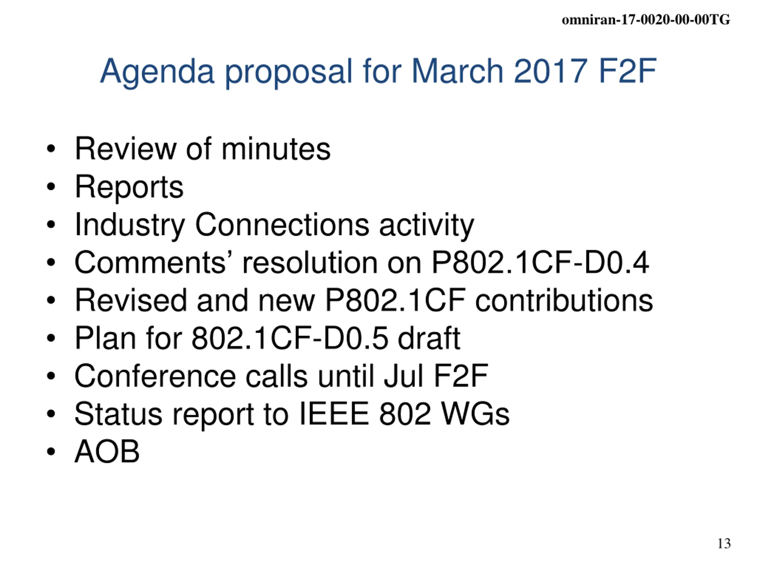 omniran-17-0020-00-00TG Agenda proposal for March 2017 F2F Review of minutes Reports Industry Connections activity Comments resolution on P802.1CF-D0.4 Revised and new P802.1CF contributions Plan for 802.1CF-D0.5 draft Conference calls until Jul F2F Status report to IEEE 802 WGs AOB 13