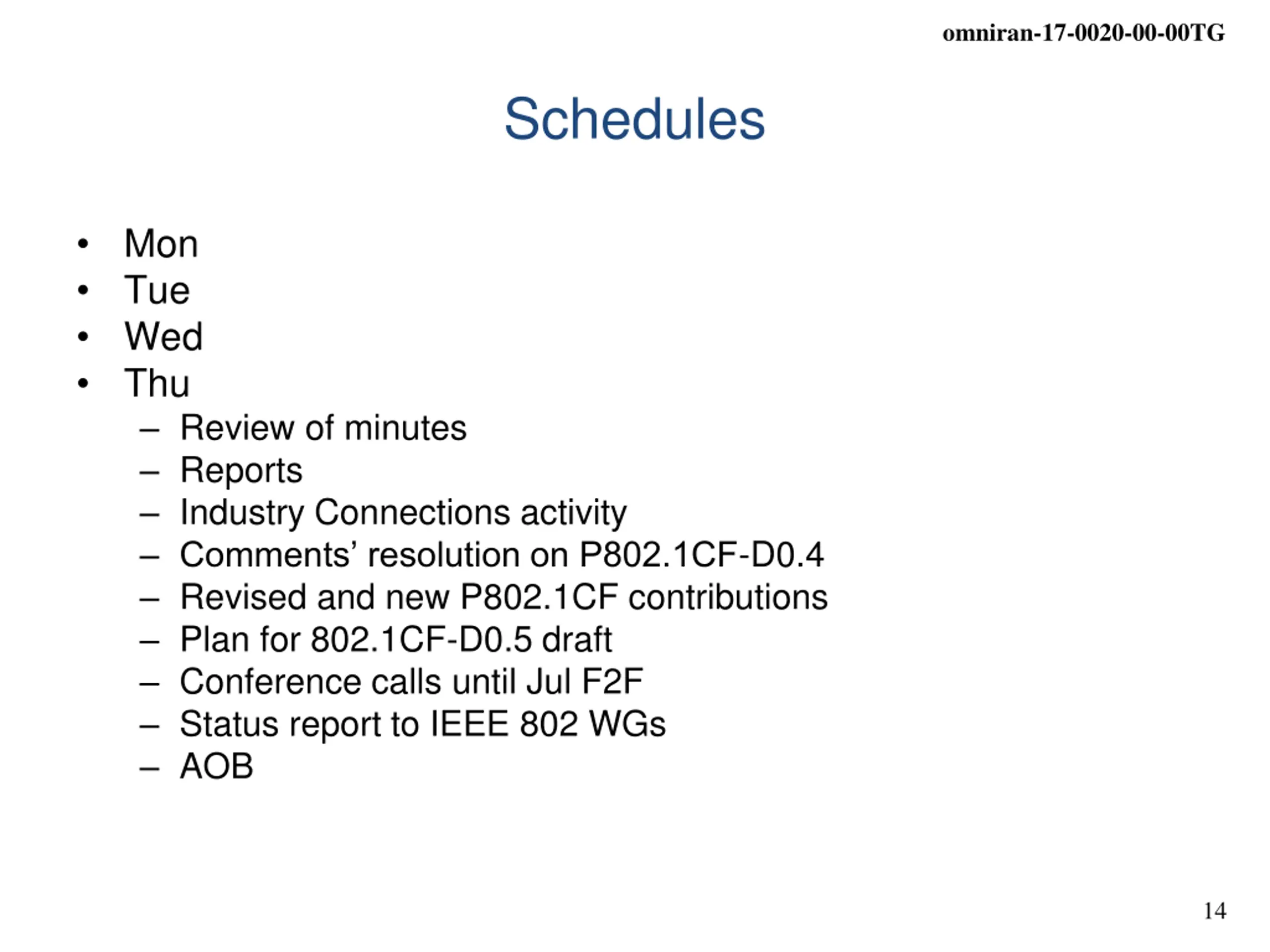 omniran-17-0020-00-00TG Schedules Mon Tue Wed Thu Review of minutes Reports Industry Connections activity Comments resolution on P802.1CF-D0.4 Revised and new P802.1CF contributions Plan for 802.1CF-D0.5 draft Conference calls until Jul F2F Status report to IEEE 802 WGs AOB 14